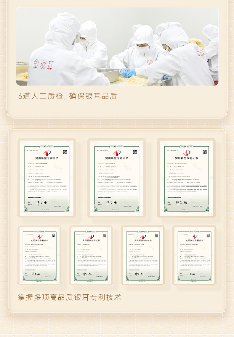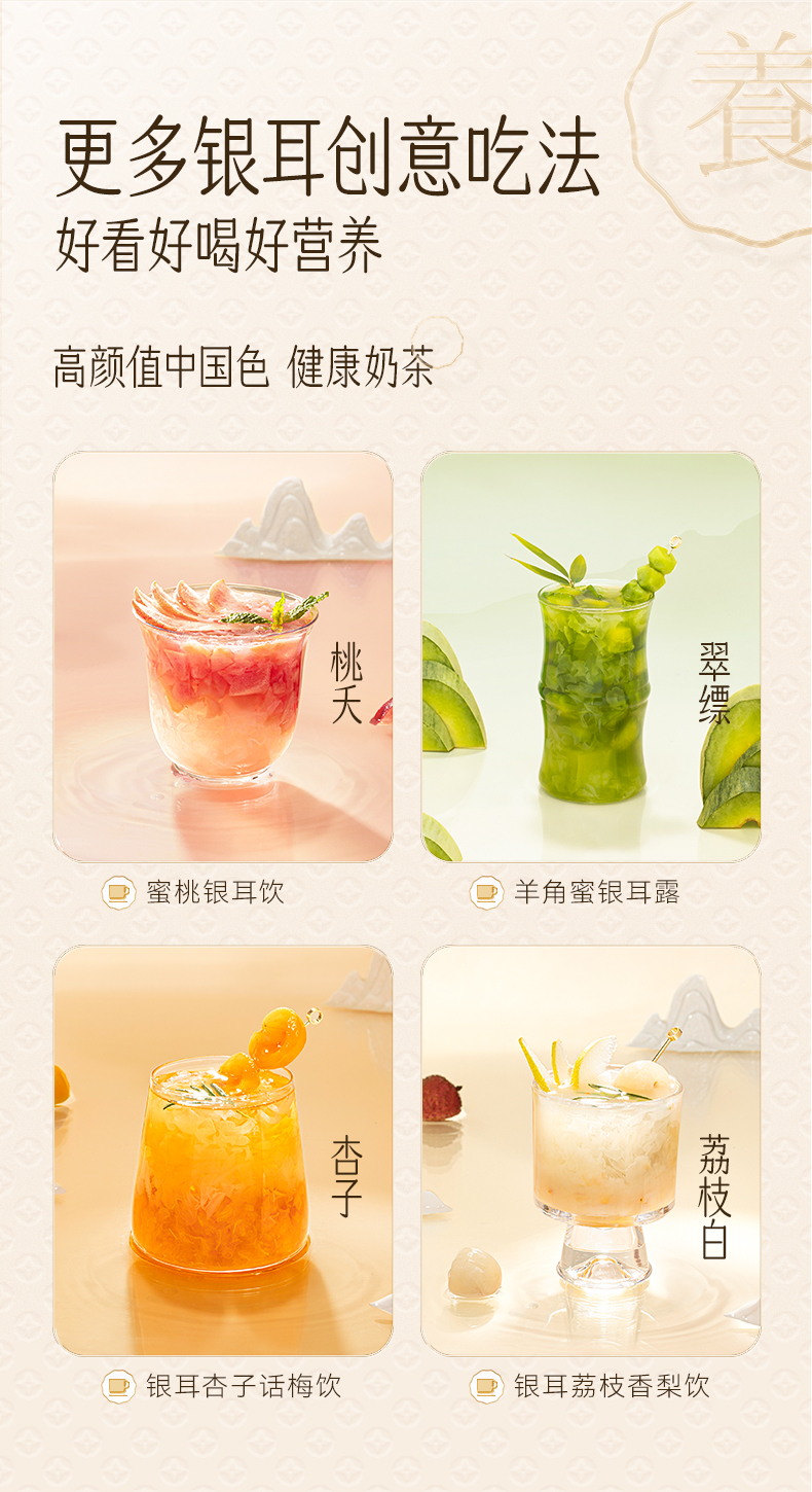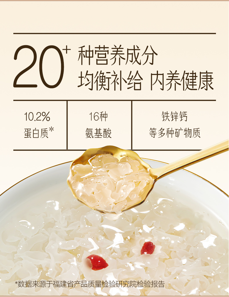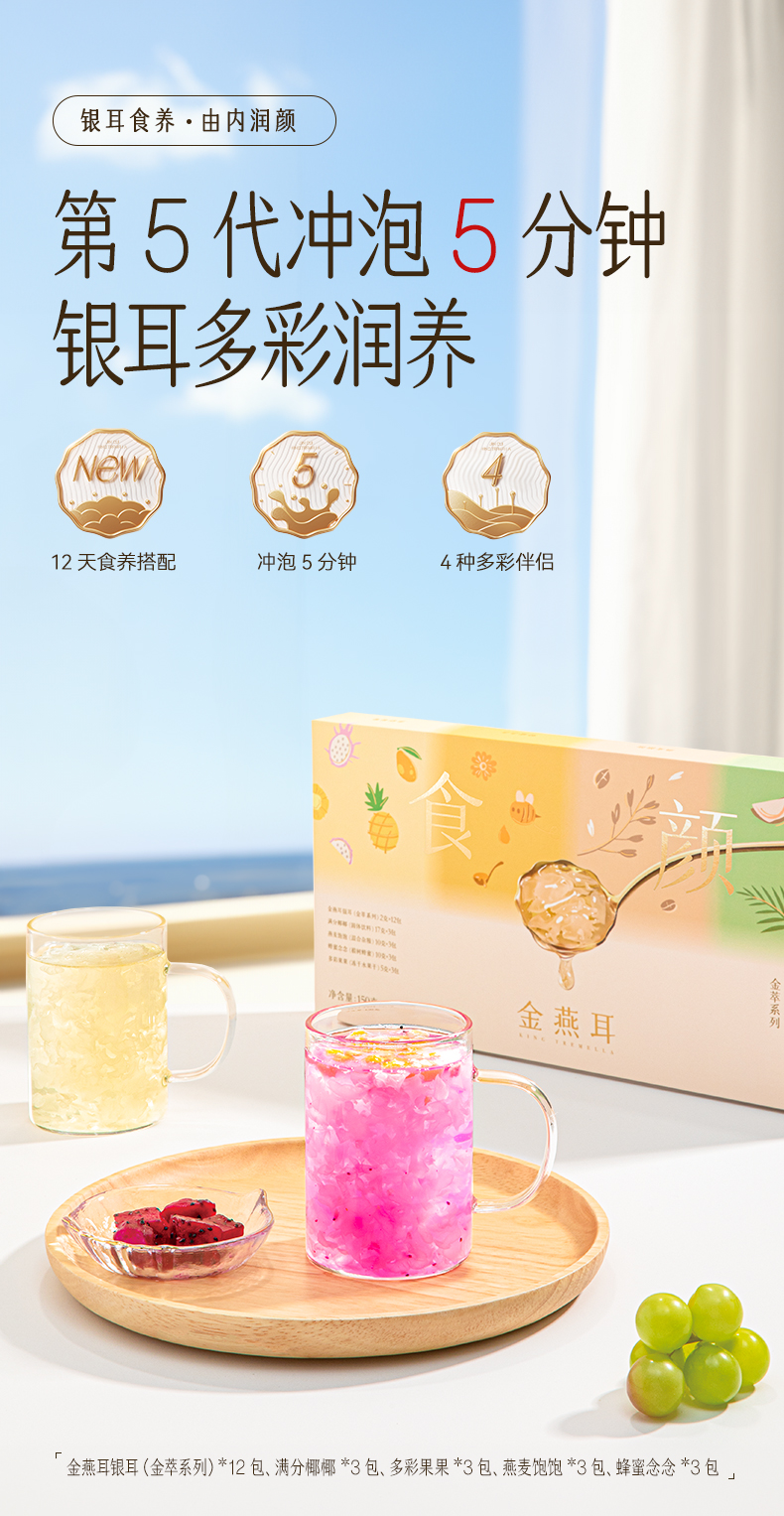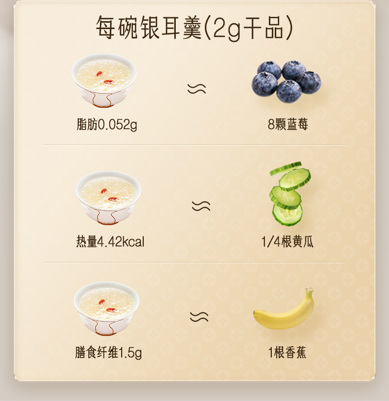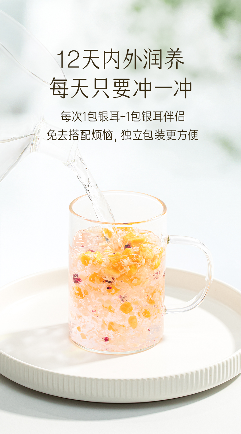 内配:金萃银耳2g*12包+椰乳粉皮17g*3条+燕麦麸皮10g*3条+蜂蜜麸皮10g*3条+冻干水果皮5g*3条