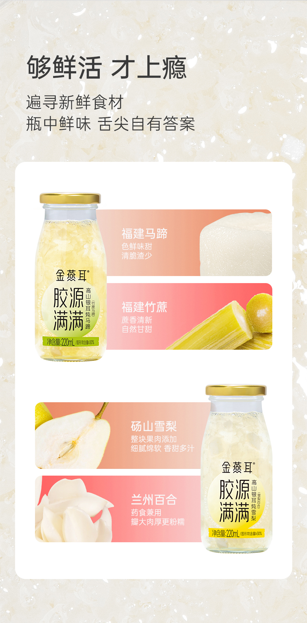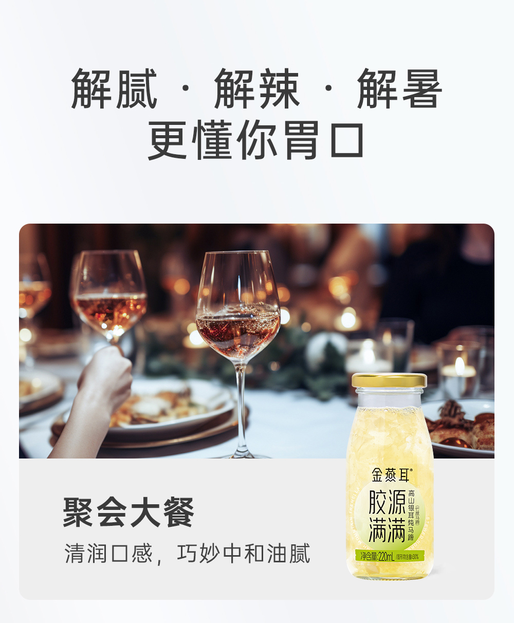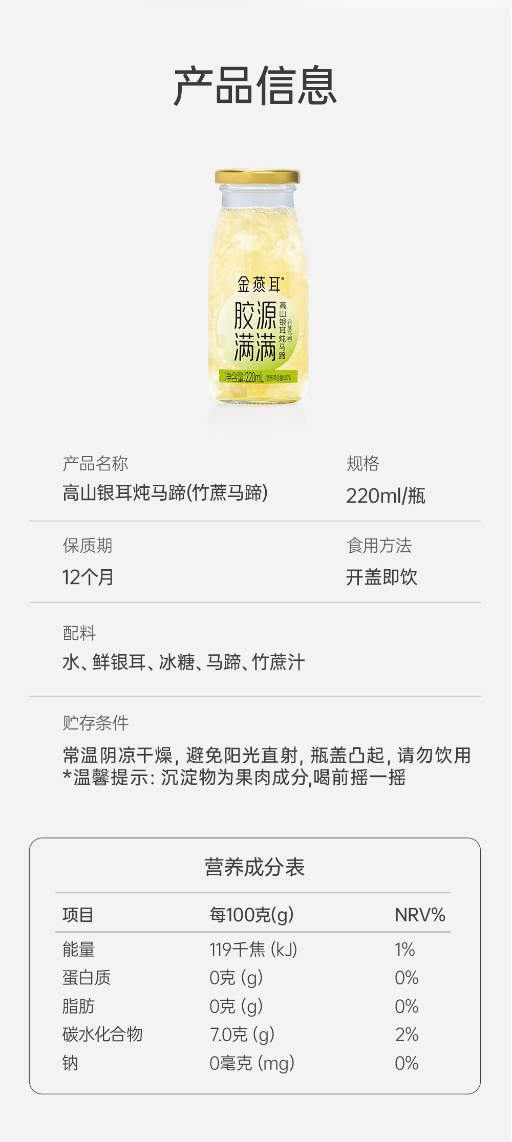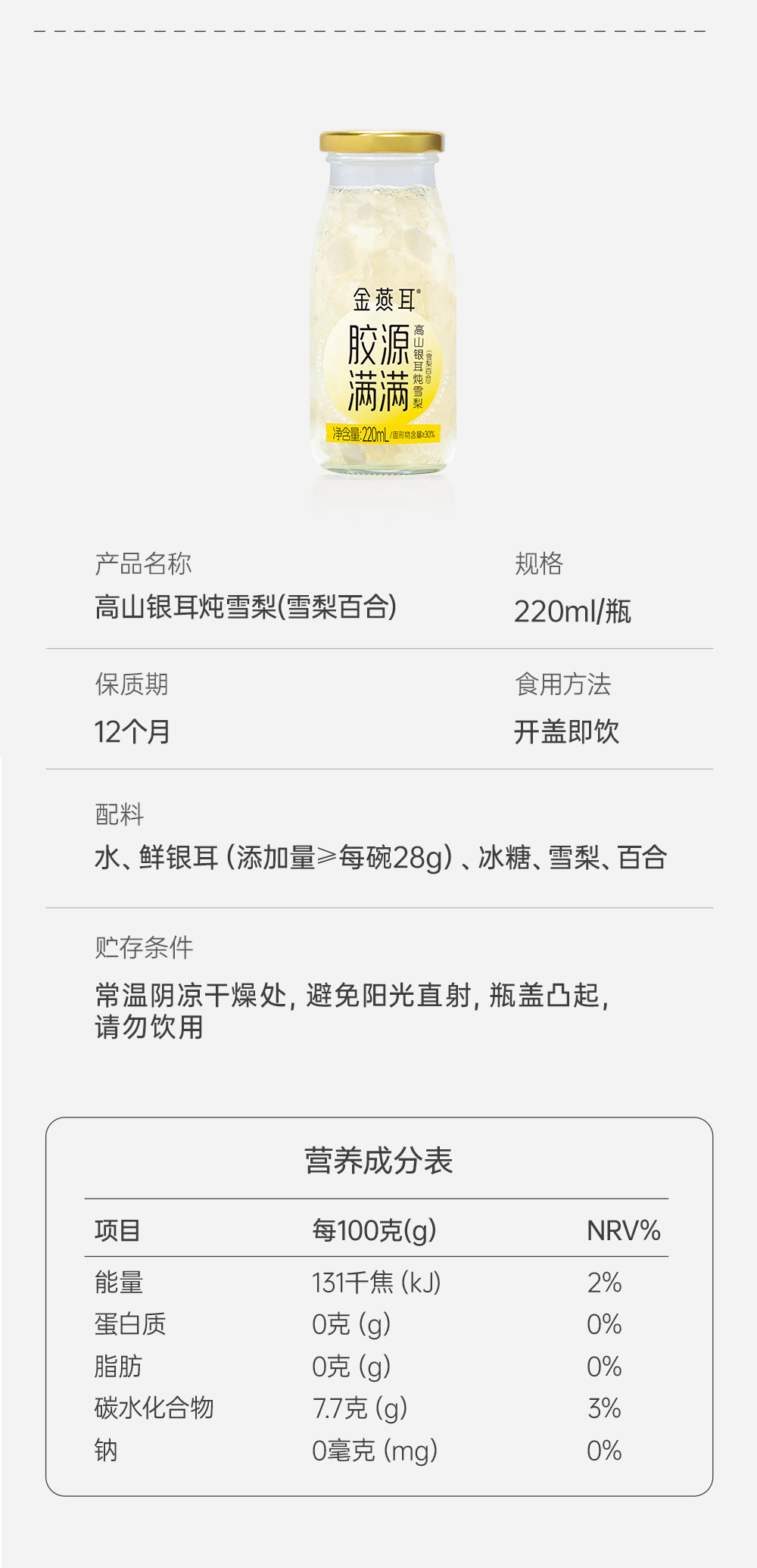 商品名称:金燕耳胶源满满高山银耳鲜露炖品220ml*6瓶