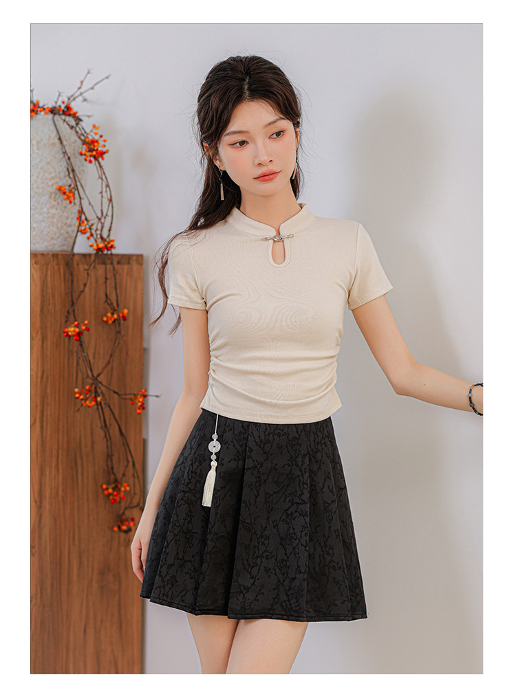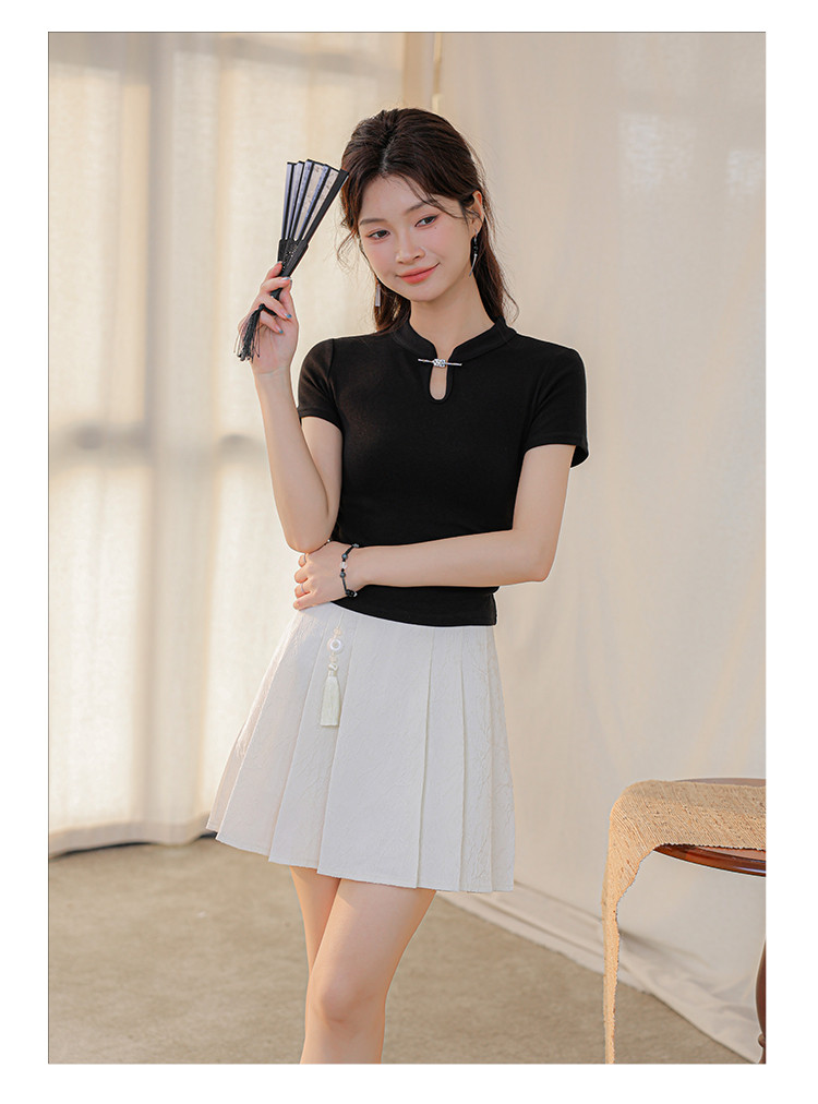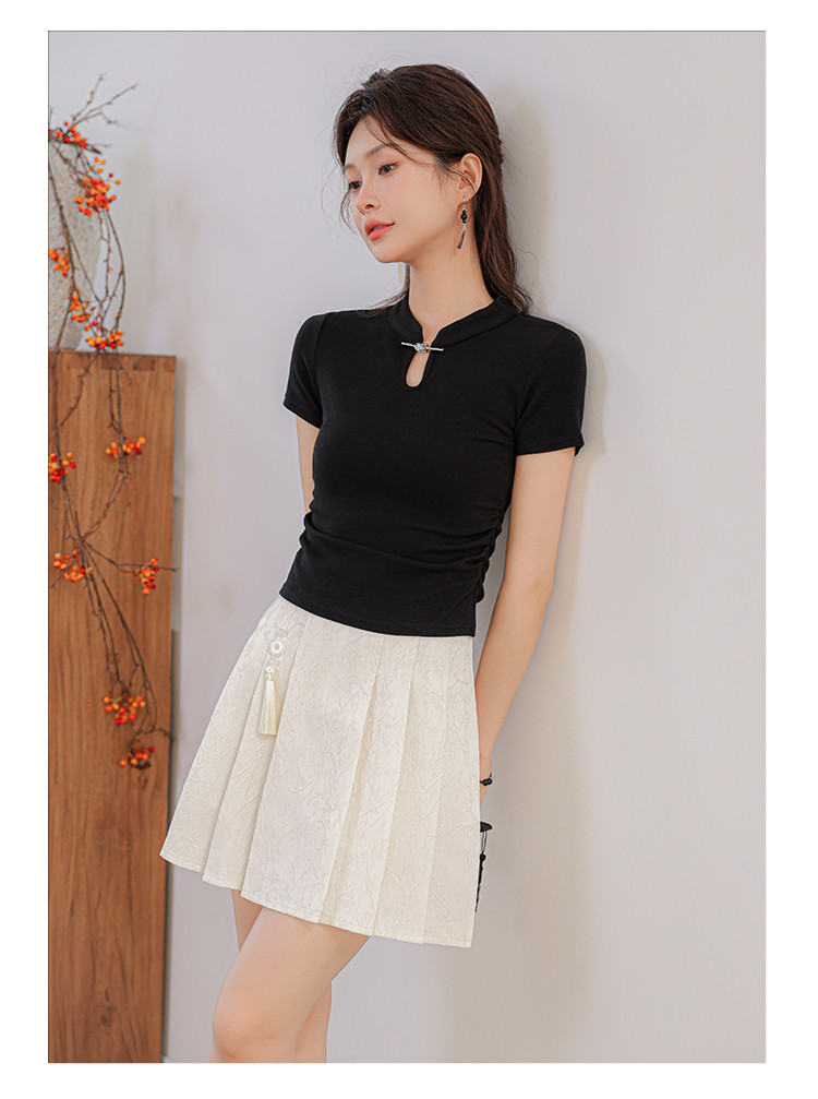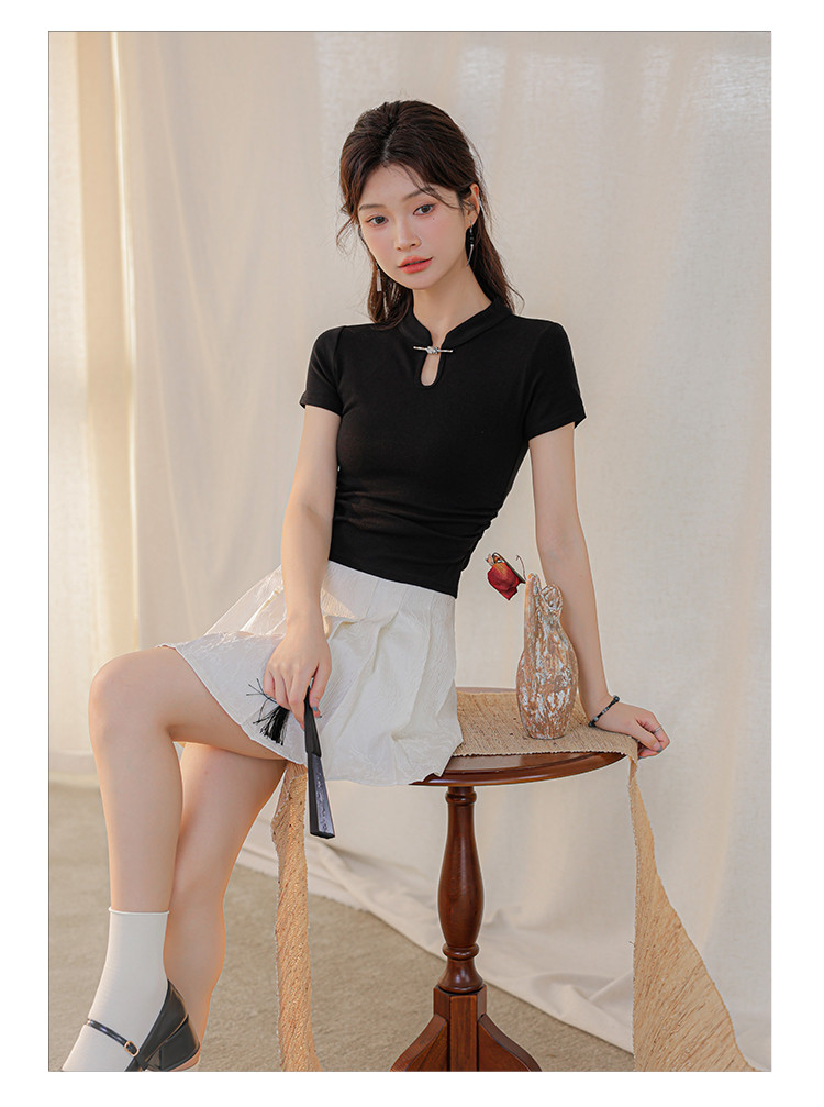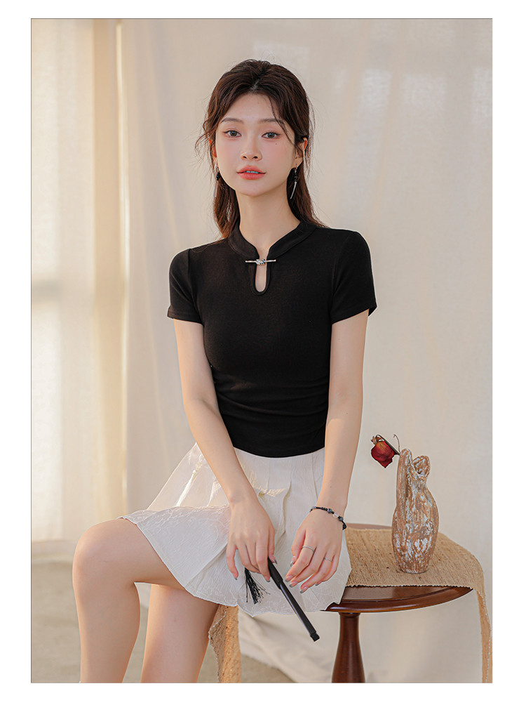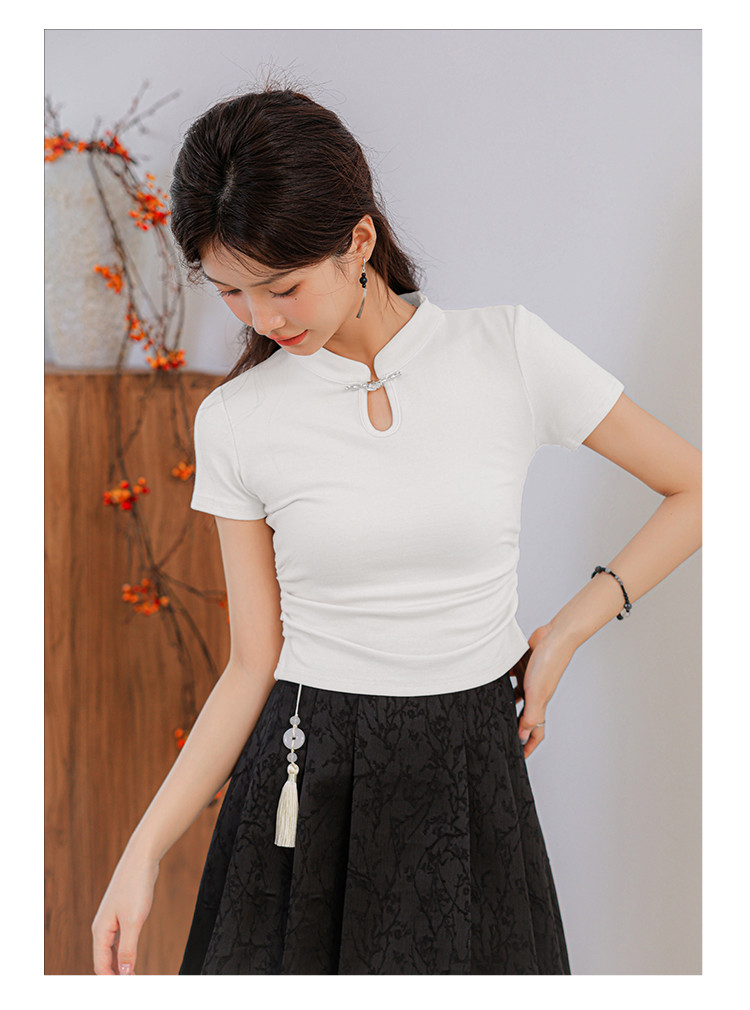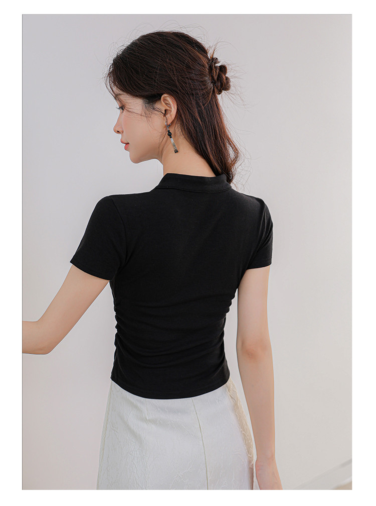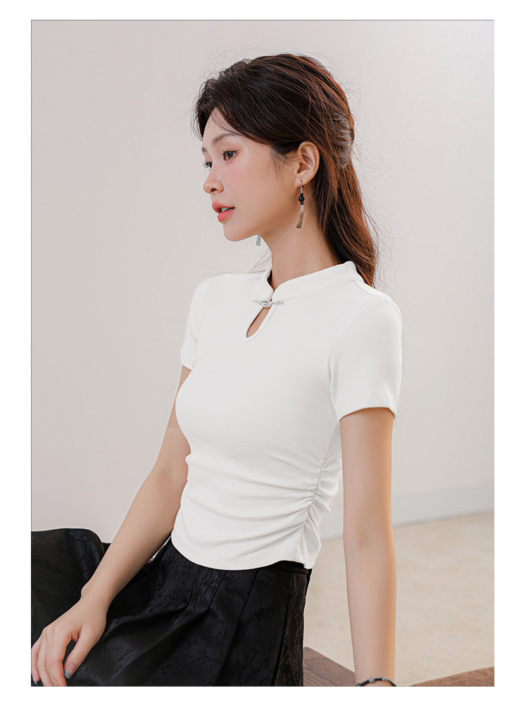 商品名称:新中式盘扣立领短袖t恤女设计修身褶皱短款上衣女 806787