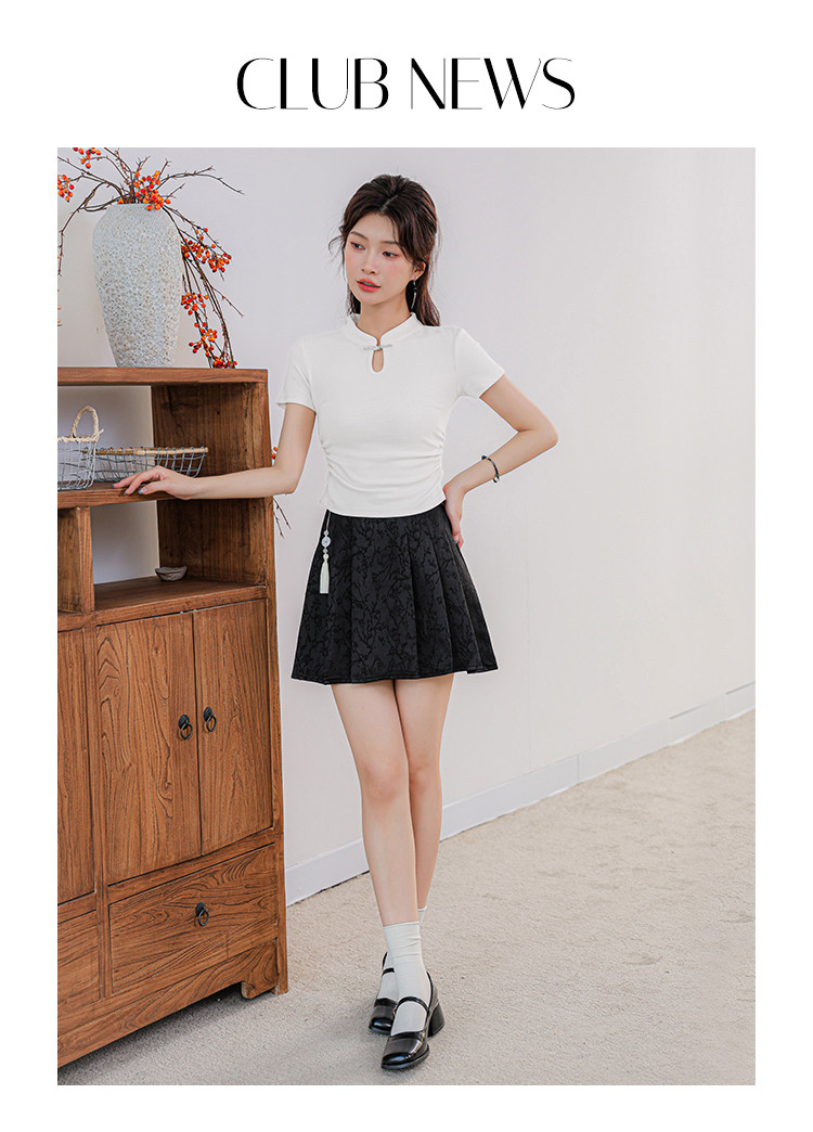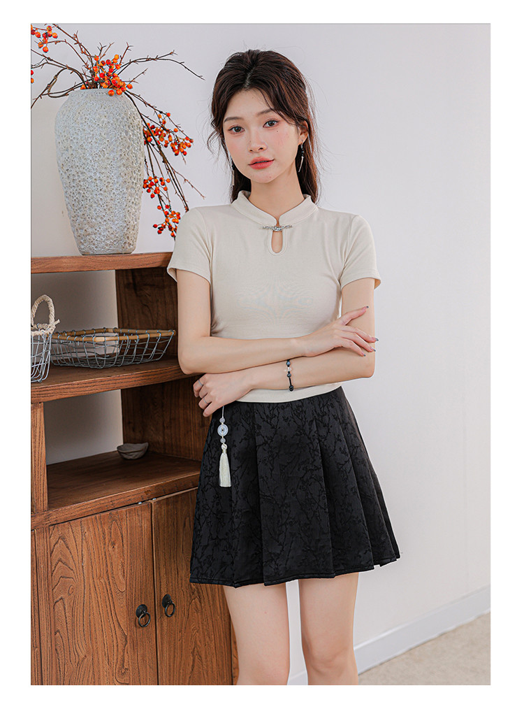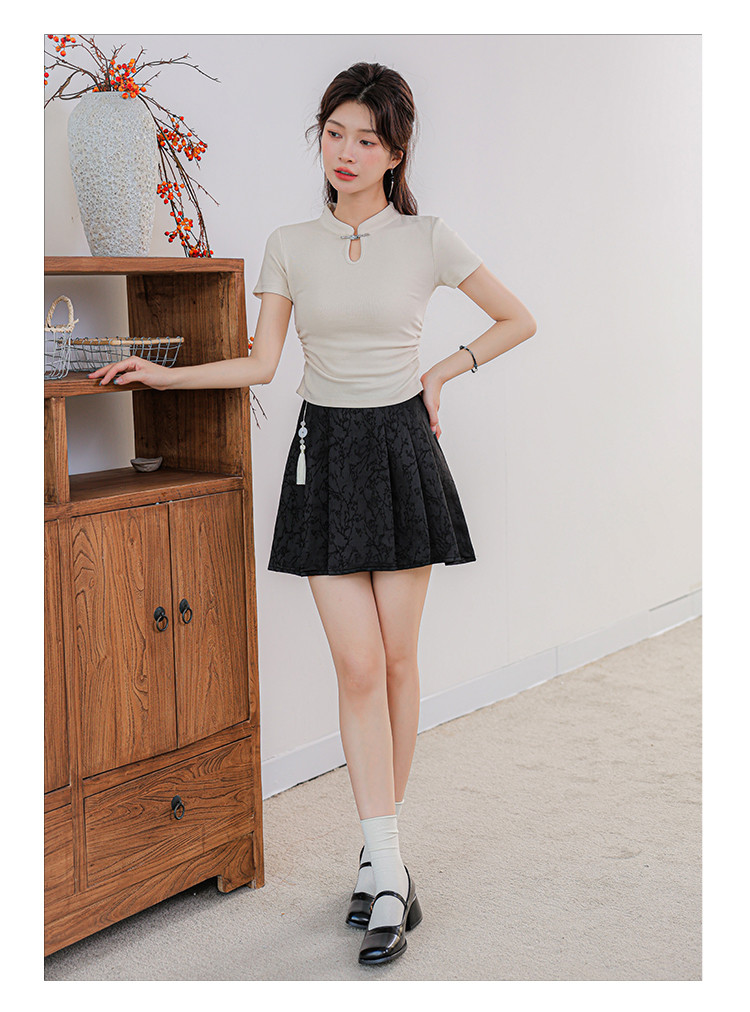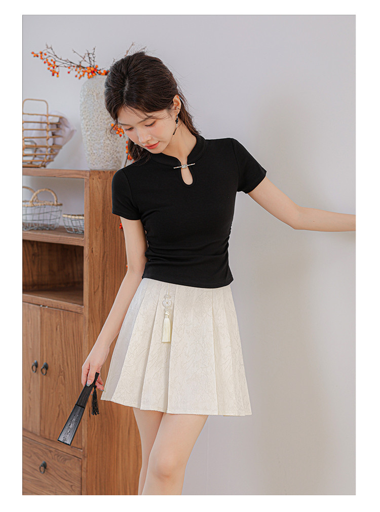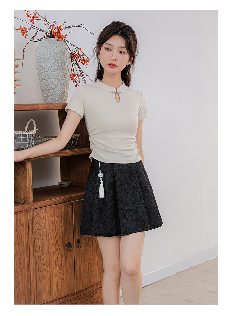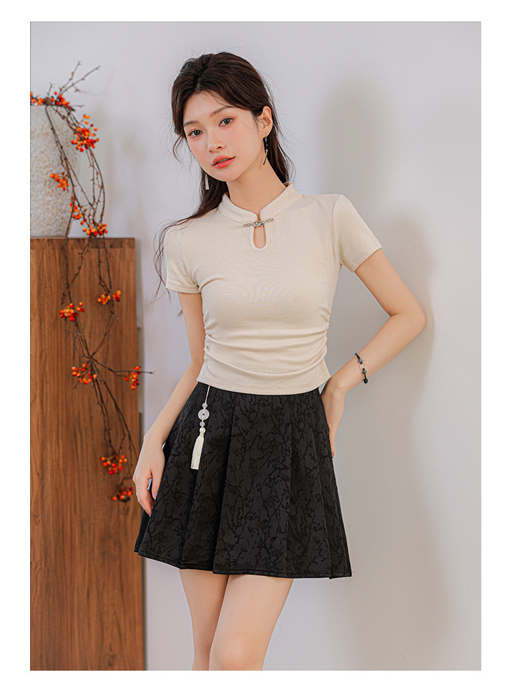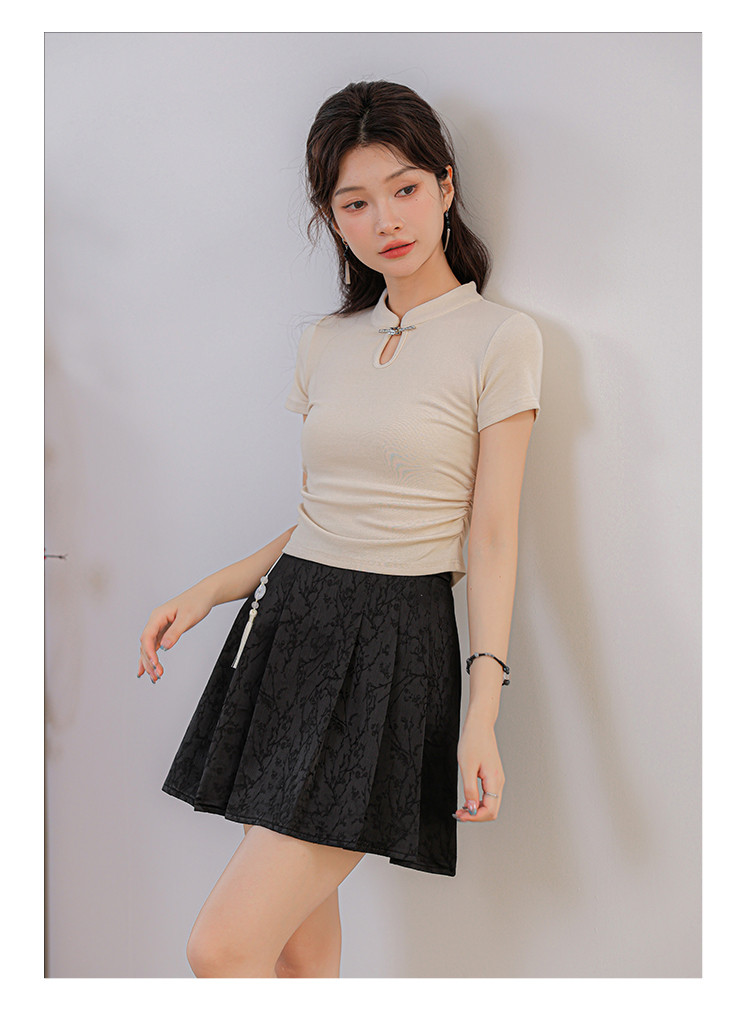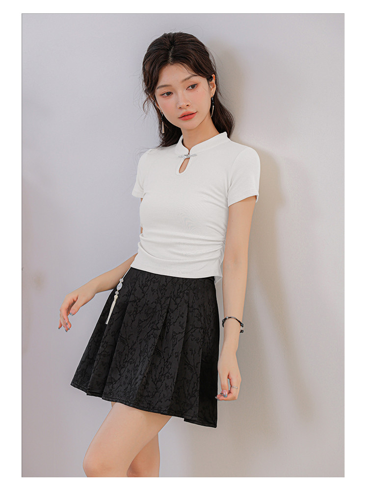 商品名称:新中式盘扣立领短袖t恤女设计修身褶皱短款上衣女 806787