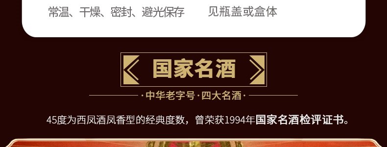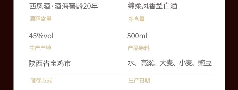 商品名称:西凤酒 白酒20年45度品鉴装纯粮酿造凤香型 500ml/瓶