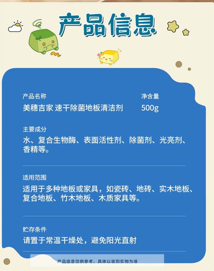 商品名称:美穗吉家(mihooce)地板清洁剂拖地扫地机器人洗地机抑菌清洗剂瓷砖清洁液 500g/瓶