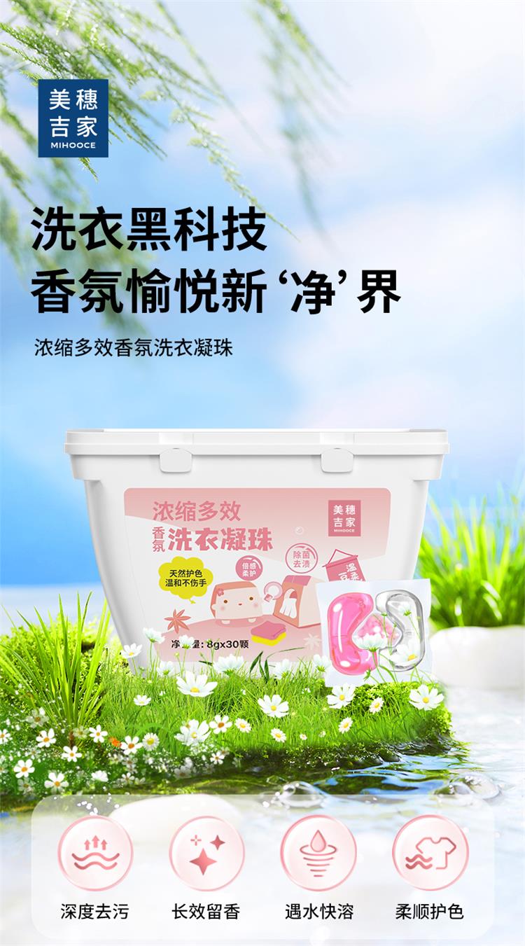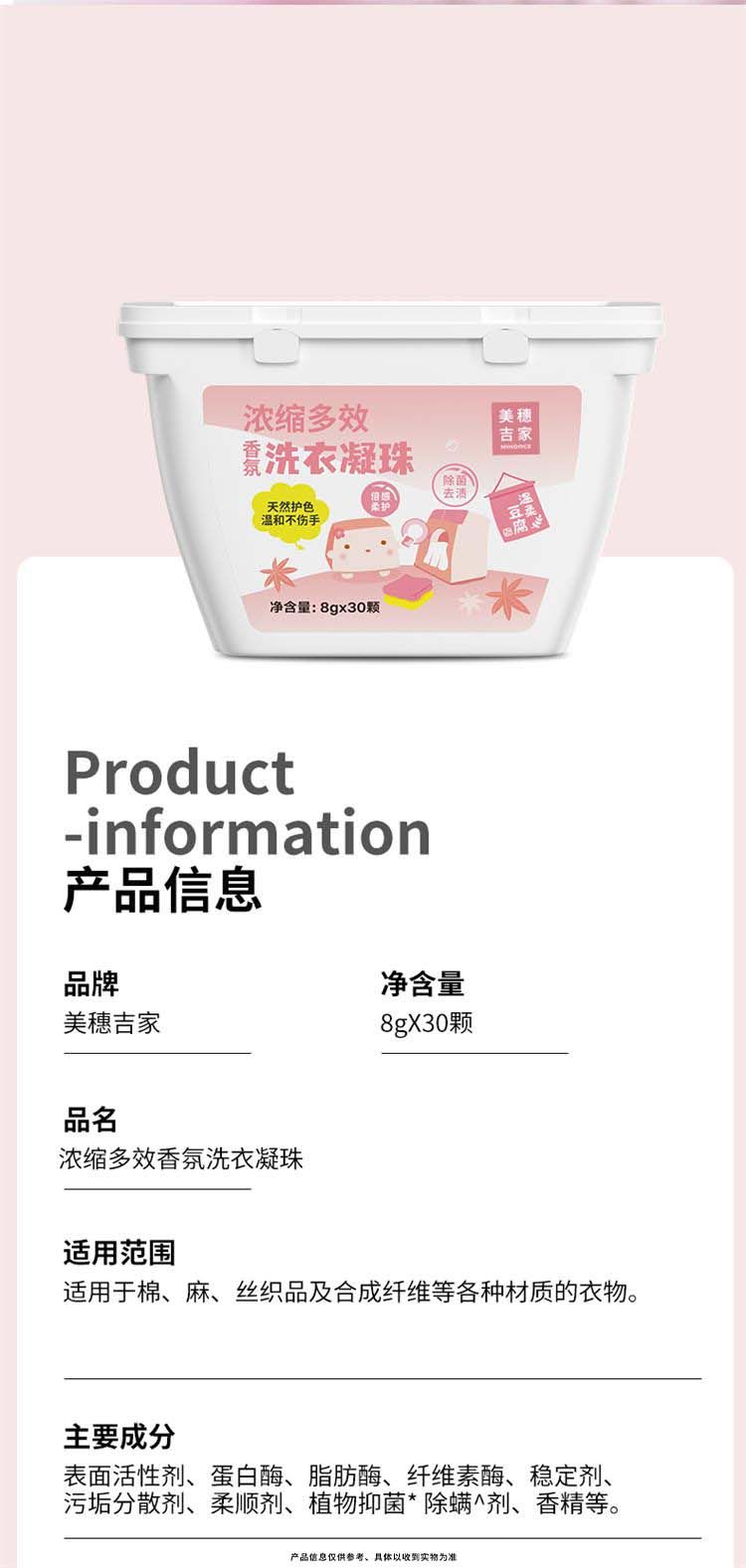 商品名称:美穗吉家(mihooce)浓缩多效香氛洗衣凝珠 柔顺去渍 1盒(8g*30颗/盒)