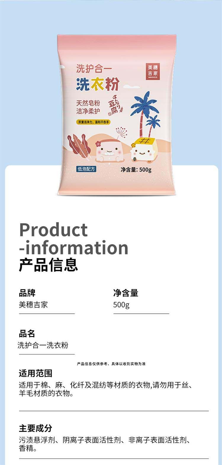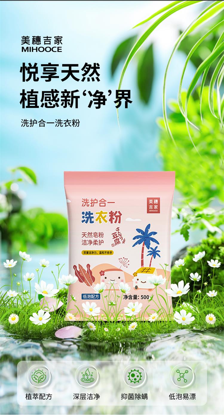 商品名称:美穗吉家(mihooce)洗衣粉洗护合一低泡配方 温和不伤手 1袋(500g/袋)
