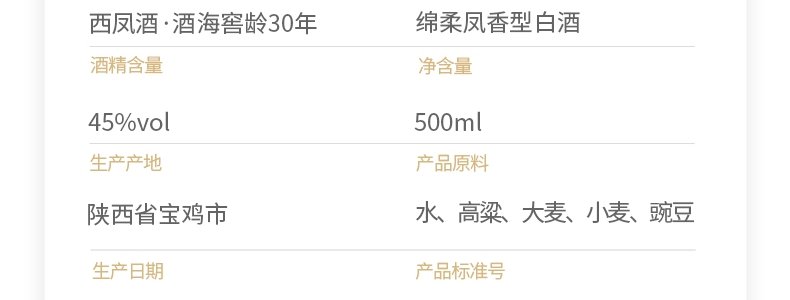 商品名称:西凤酒 酒海窖龄30年45度凤香型白酒 500ml/瓶