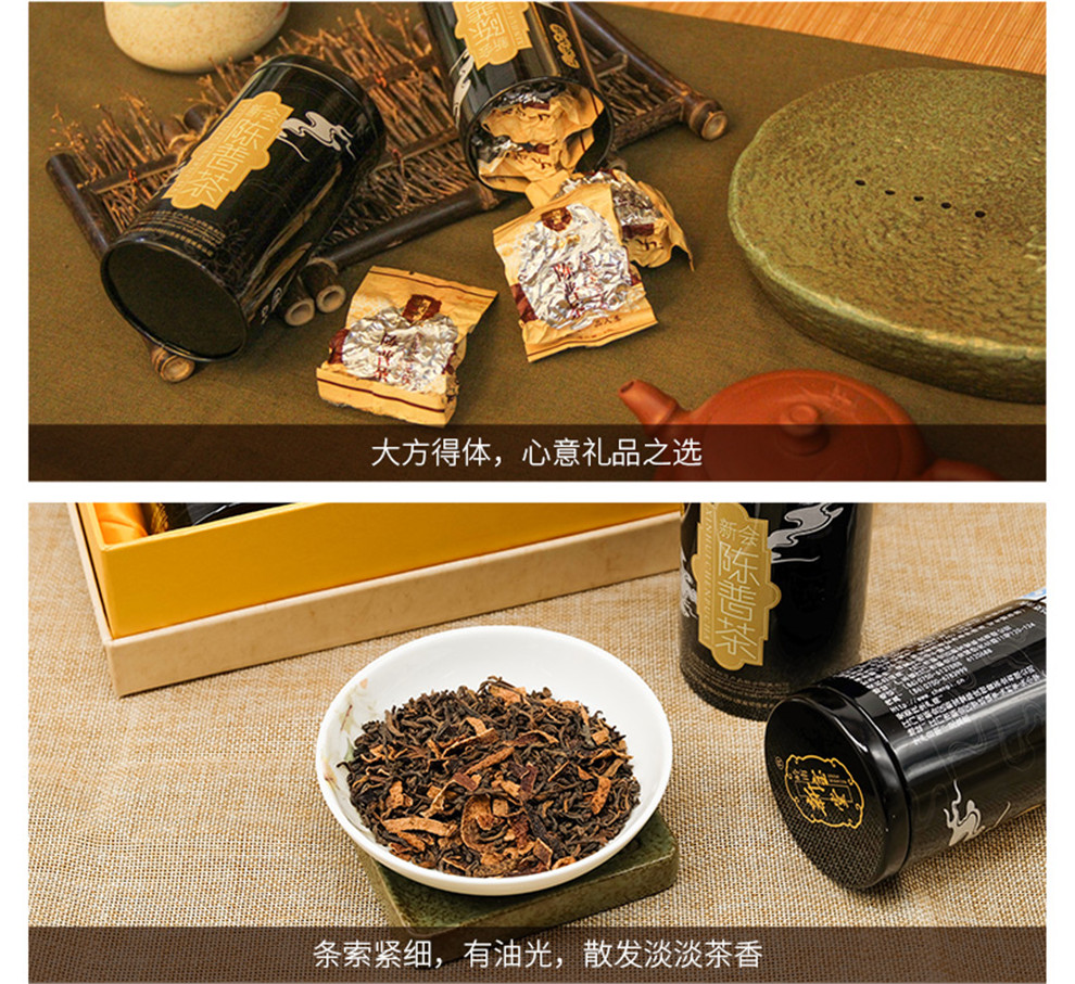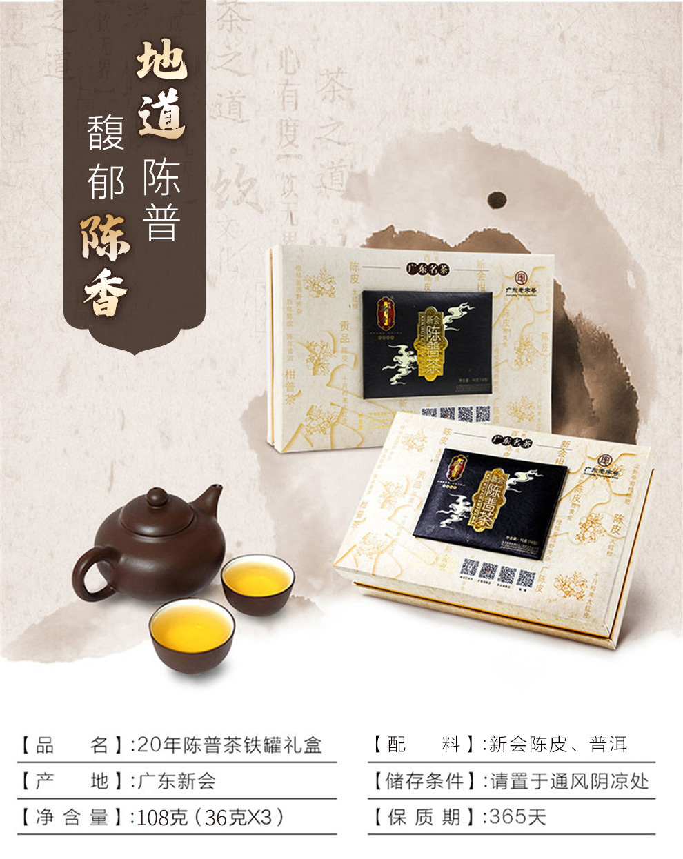 商品名称:新宝堂二十年陈皮普洱茶铁罐礼盒108g