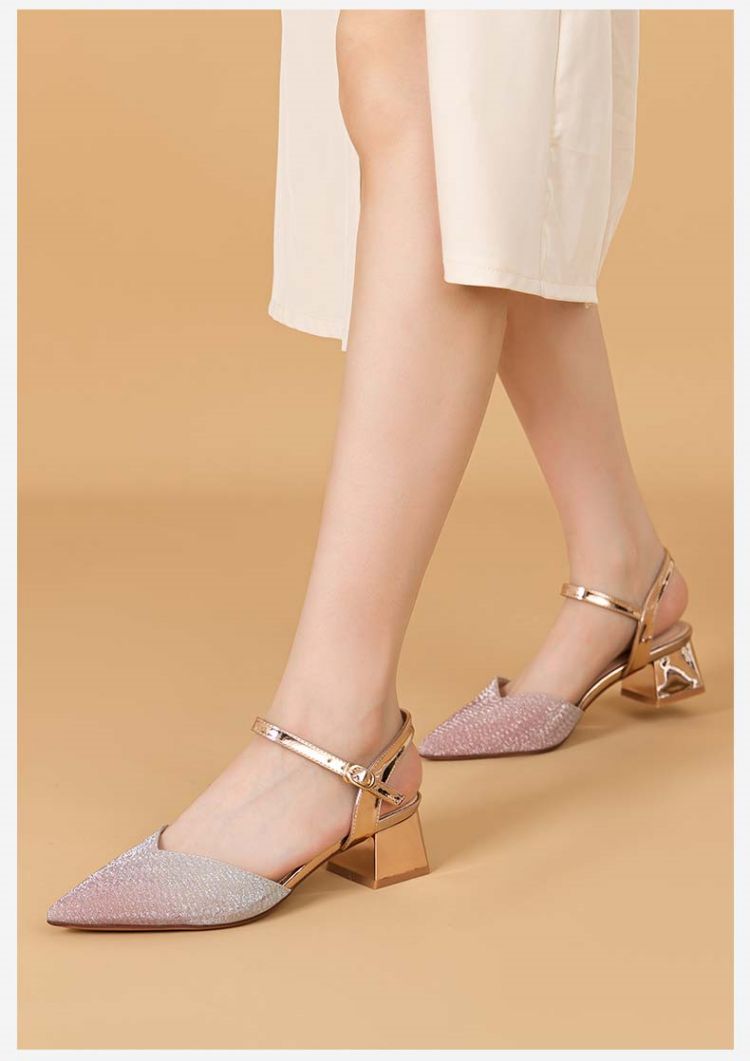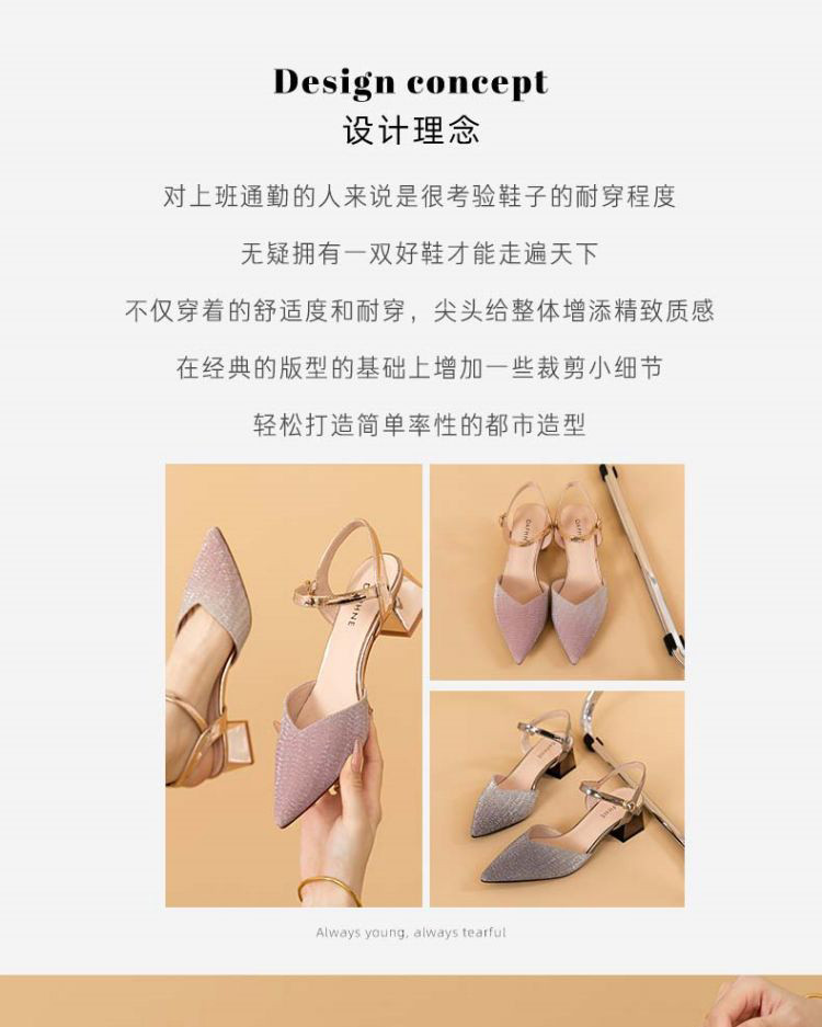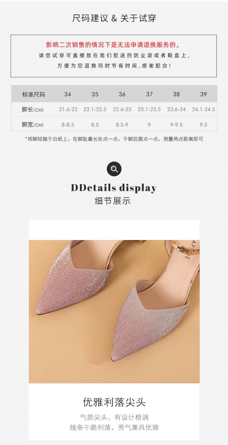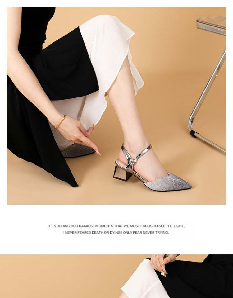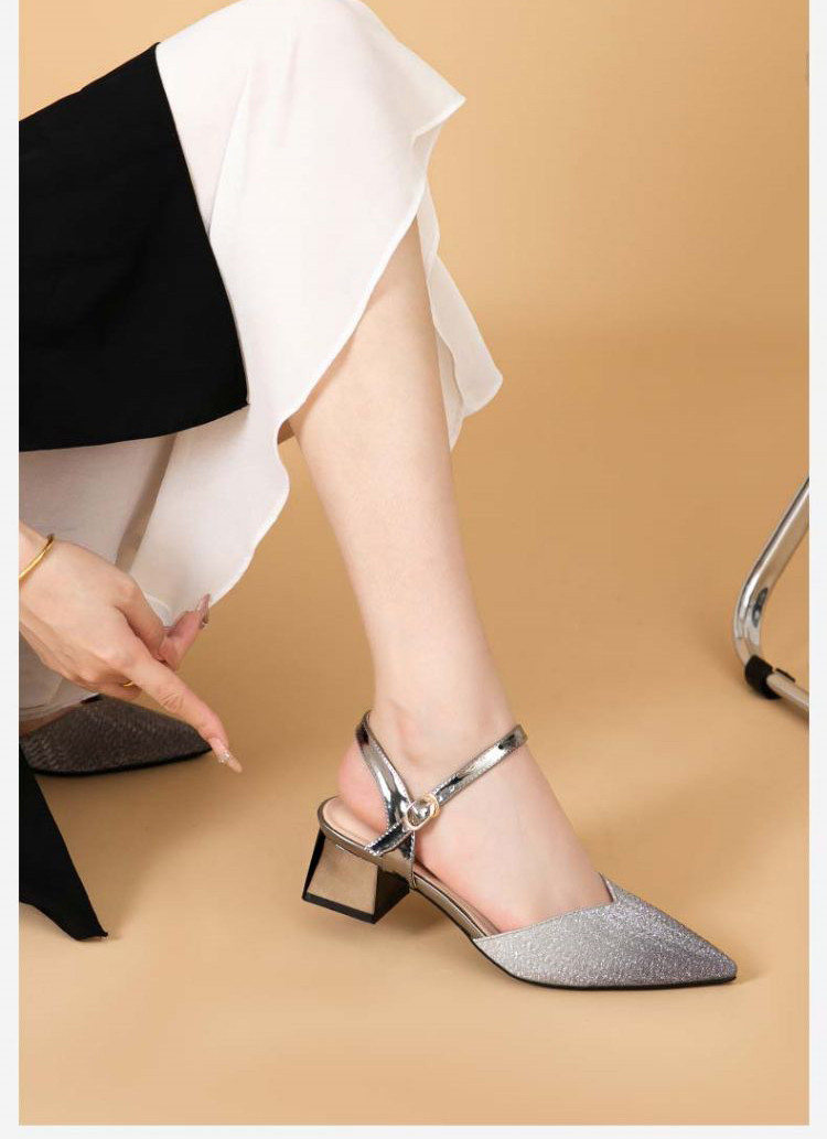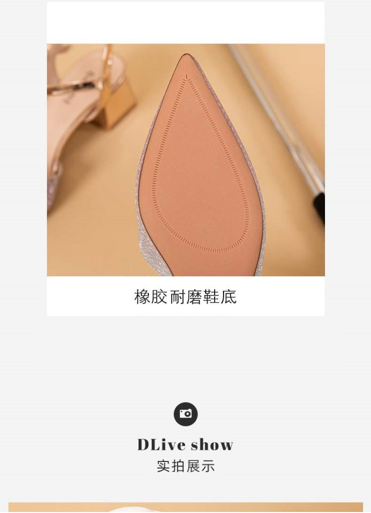 商品名称:【热卖爆款】夏季一字带高跟凉鞋尖头渐变闪钻粗跟舒适中空凉鞋 950807
