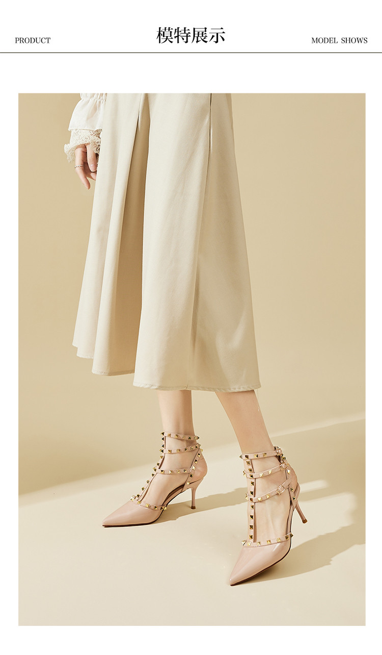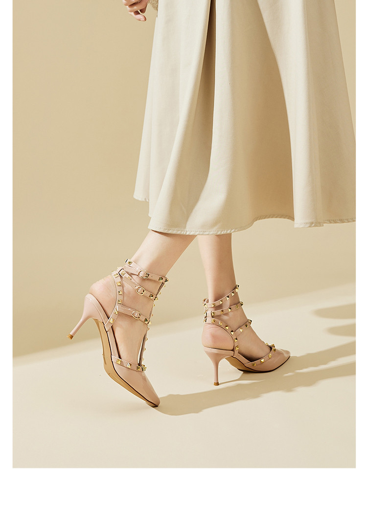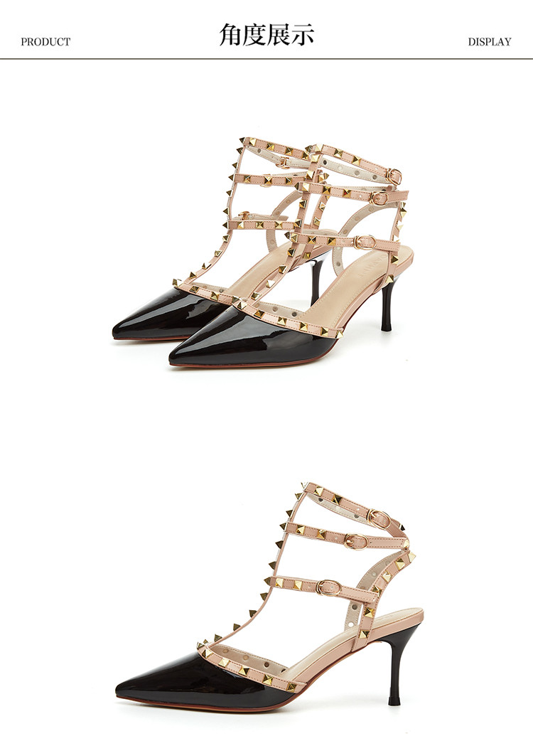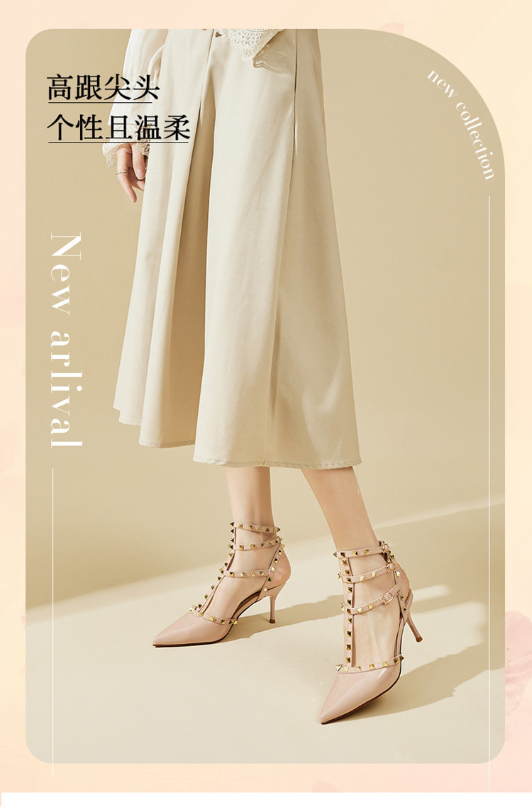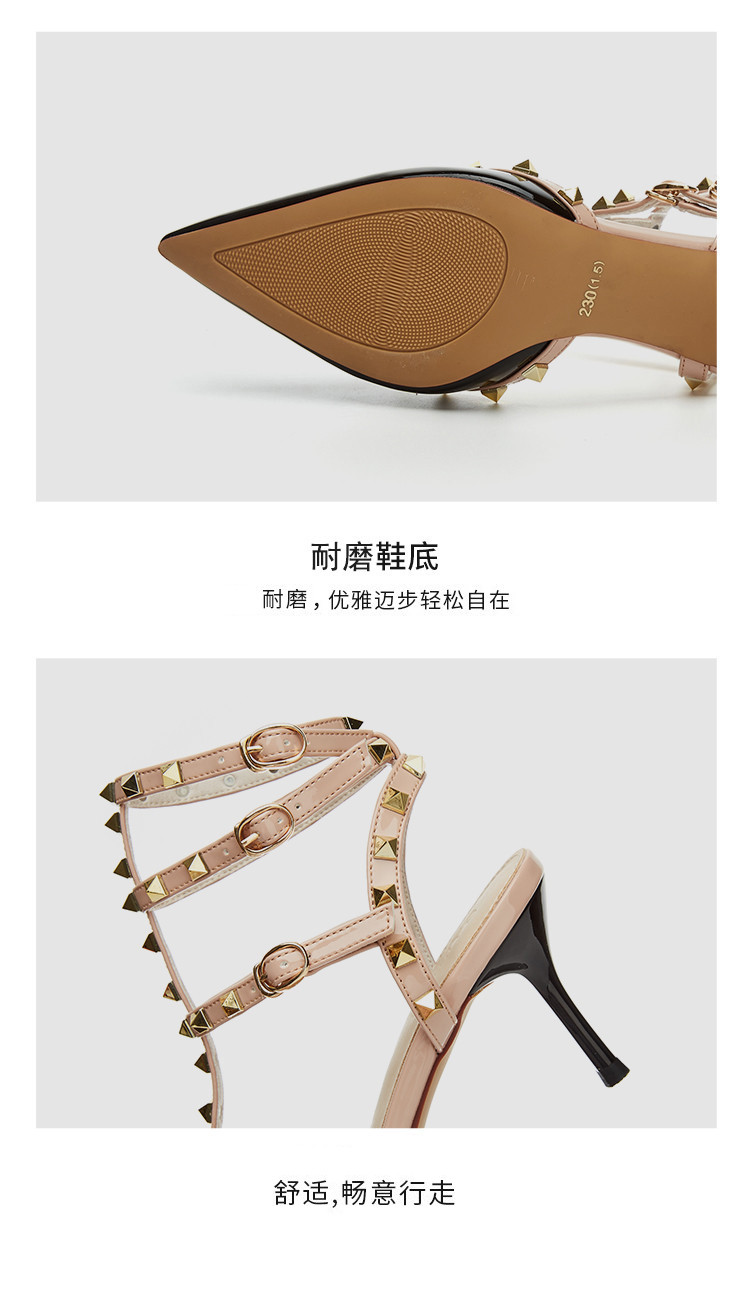 商品名称:夏季铆钉尖头细跟高跟鞋罗马凉鞋女一字带凉拖时尚小众单鞋时装鞋 573655