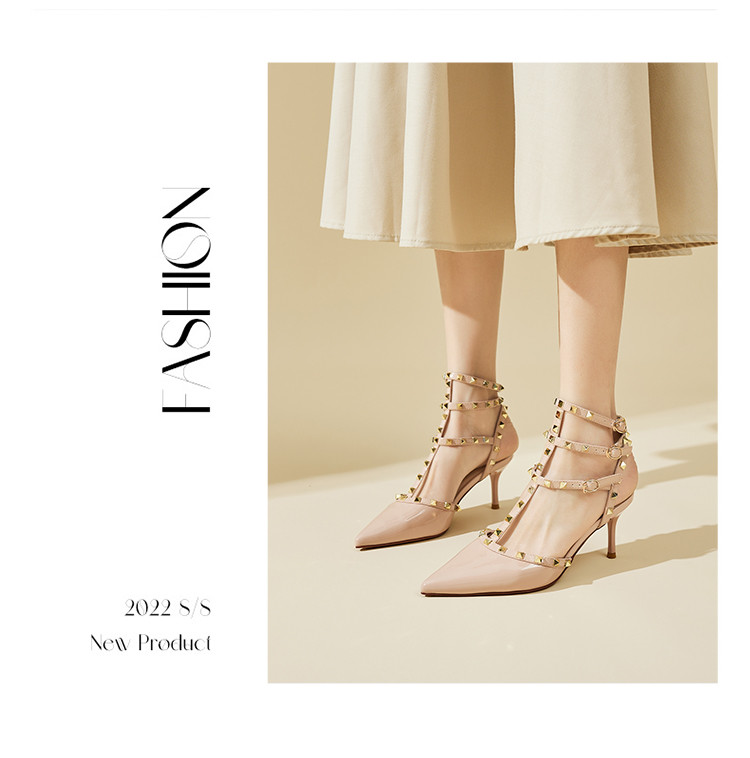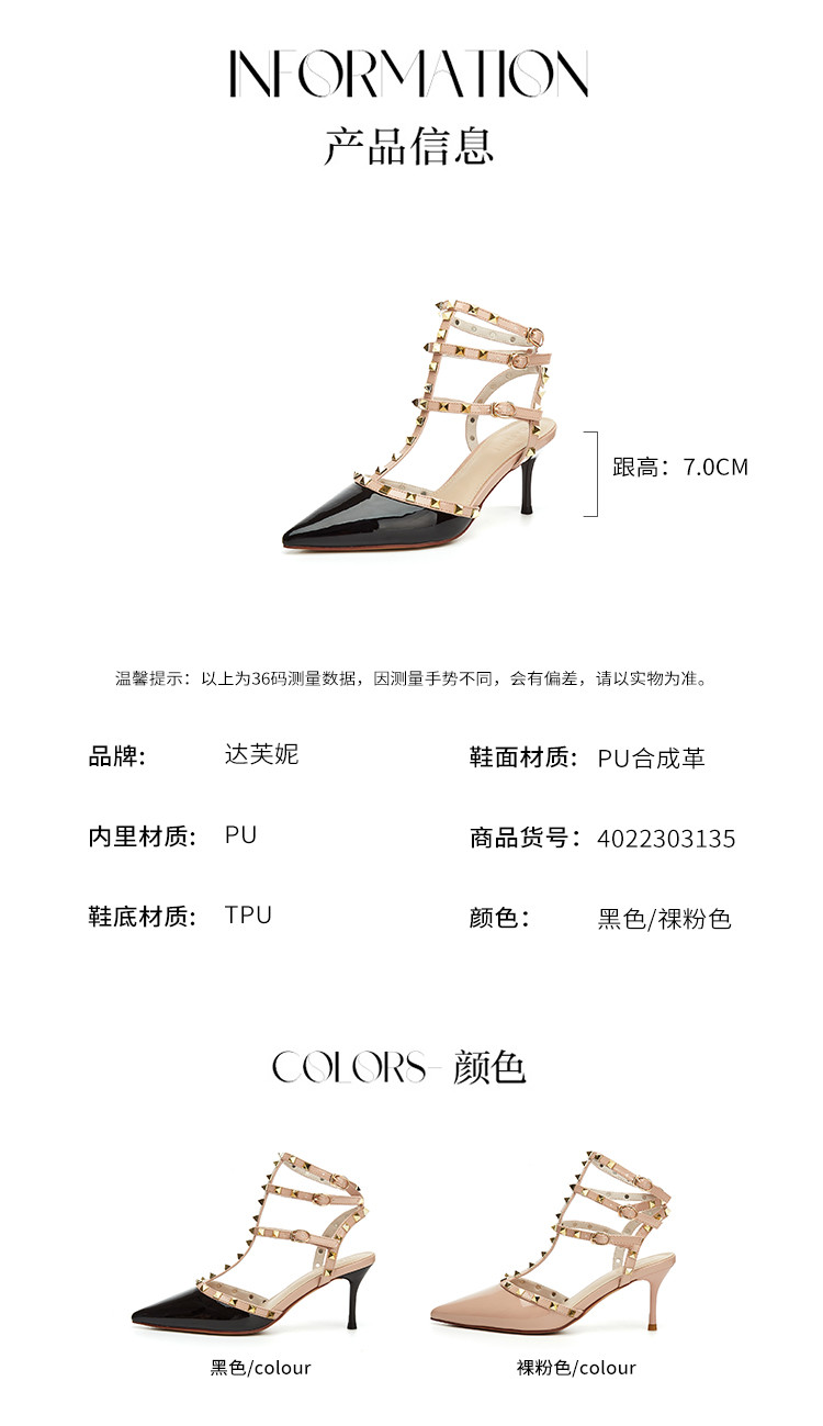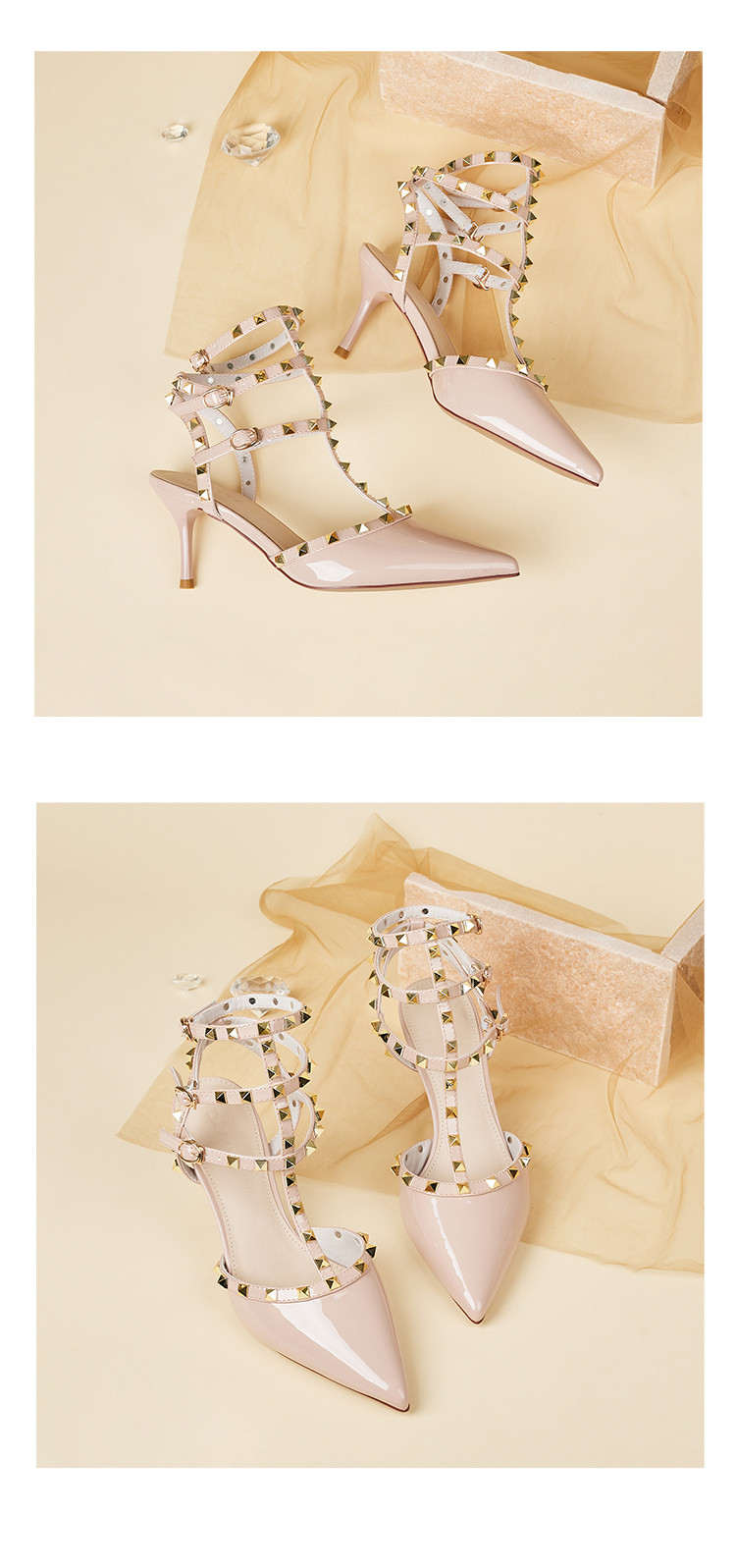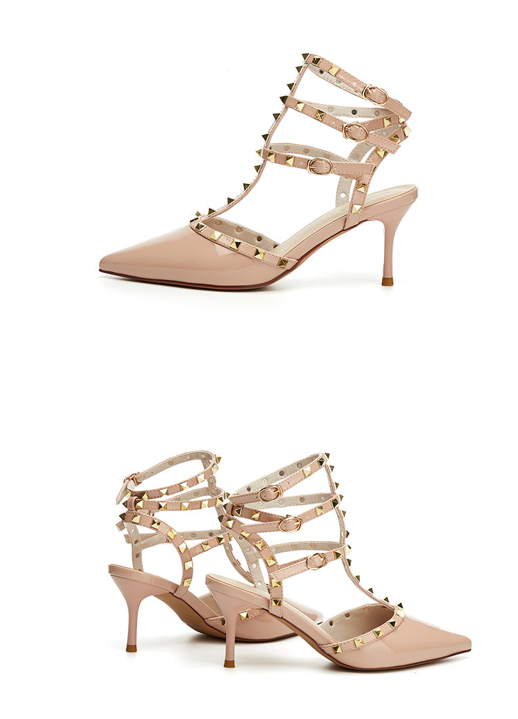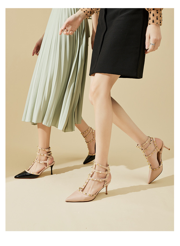 商品名称:夏季铆钉尖头细跟高跟鞋罗马凉鞋女一字带凉拖时尚小众单鞋时装鞋 573655