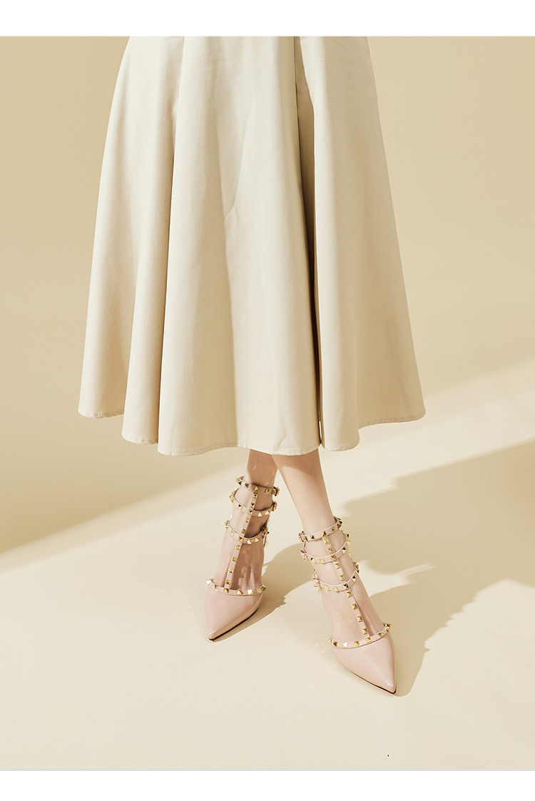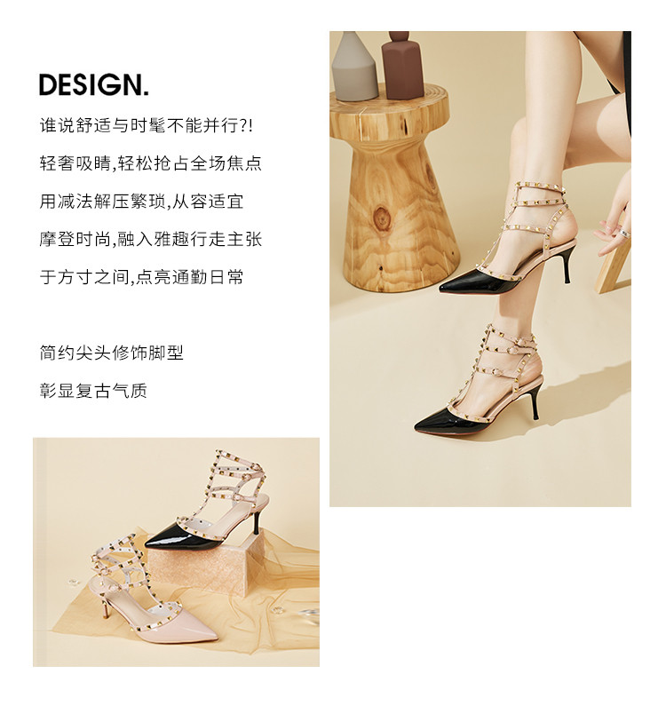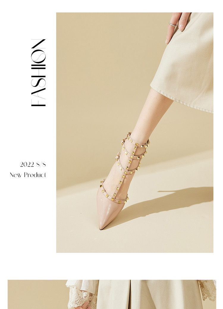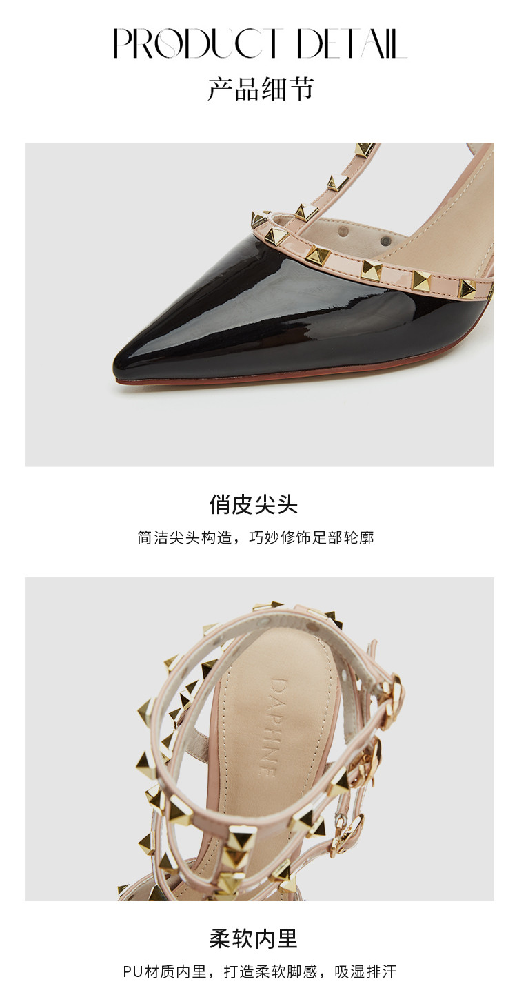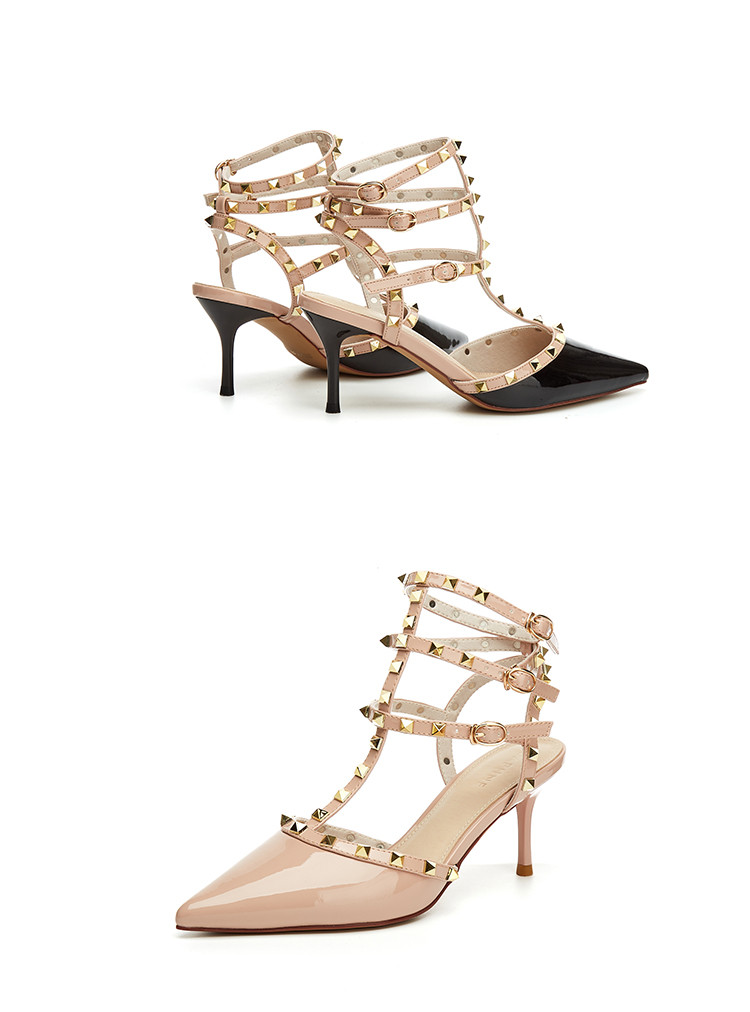 商品名称:夏季铆钉尖头细跟高跟鞋罗马凉鞋女一字带凉拖时尚小众单鞋时装鞋 573655