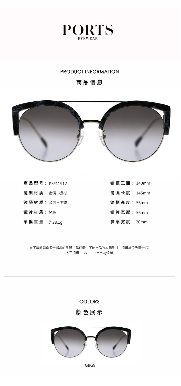 PORTS休闲女款个性双梁镂空猫眼框女士太阳镜PSF11912 988618