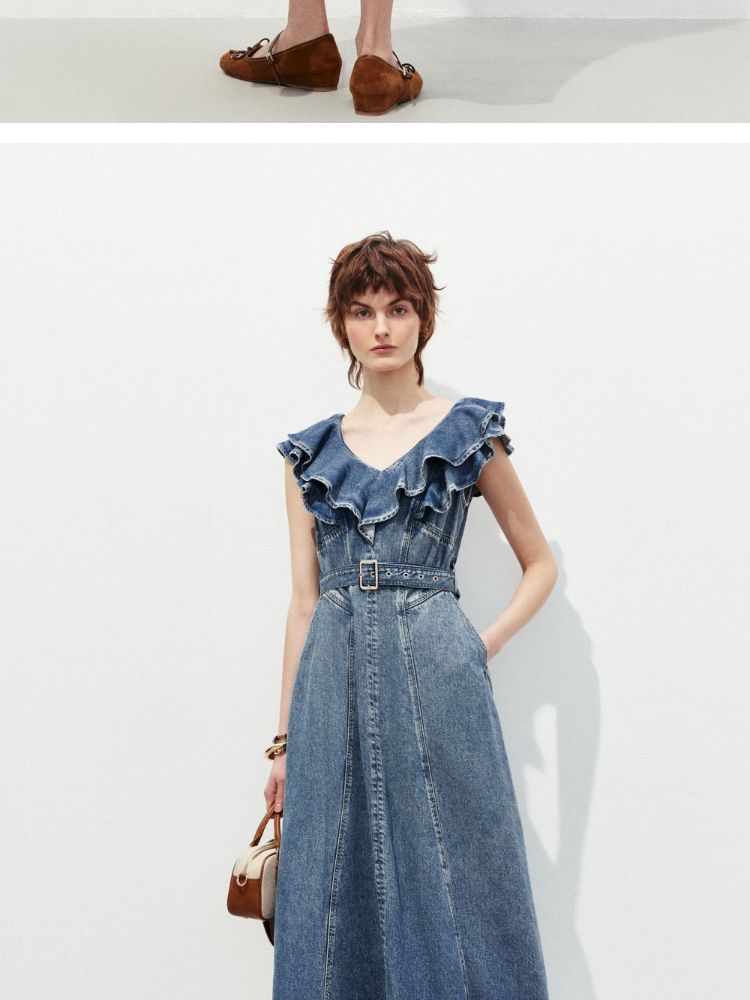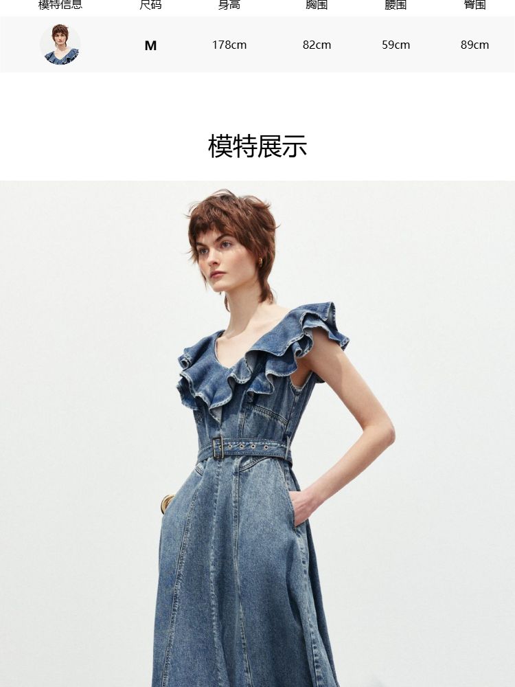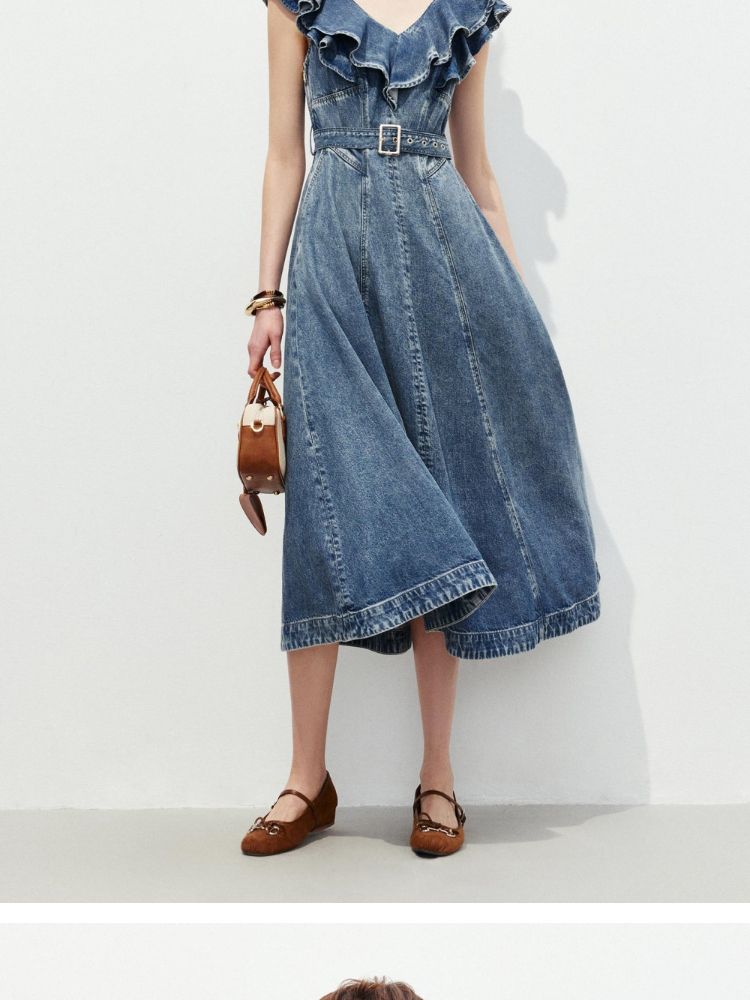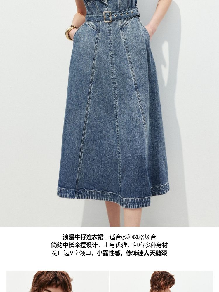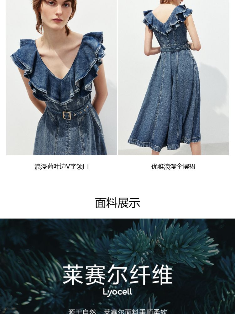 商品名称:【莱赛尔面料】2025春季浪漫风荷叶边V领中长裙牛仔连衣裙女 913370