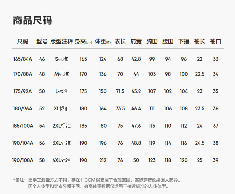 | S(推荐56~62kg) | 68 | 42.8 | 94 | 22 | 99 | 96 | 165/84A |