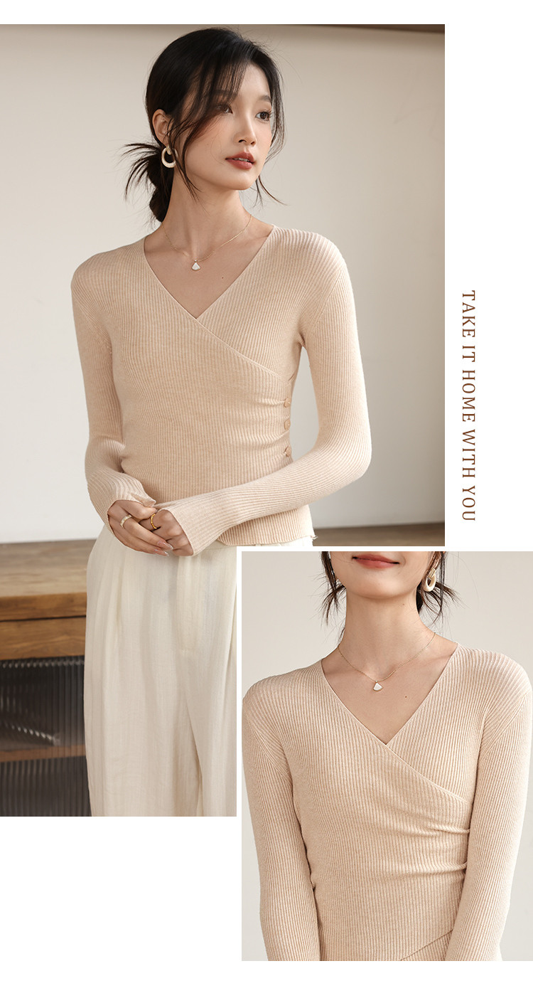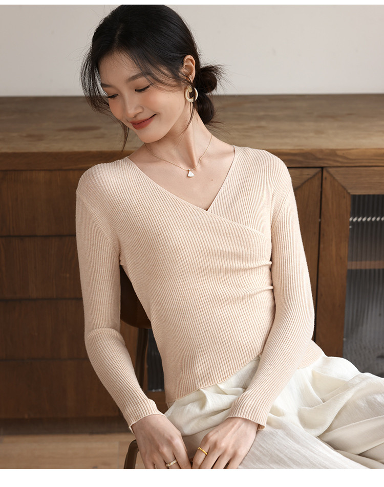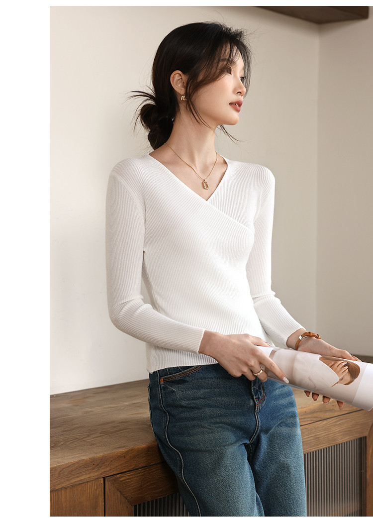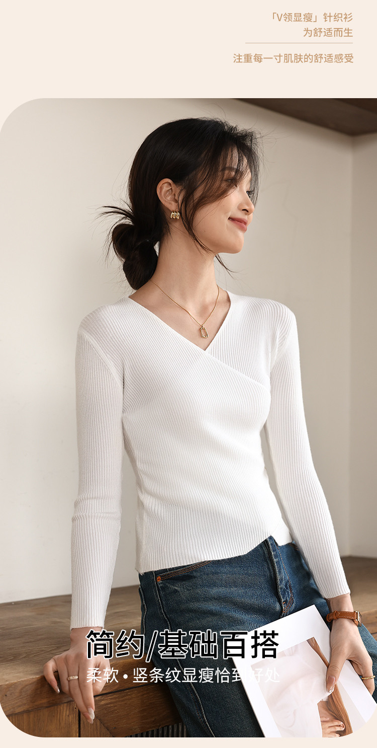 纯欲紧身V领显瘦长袖女春秋打底衫简约气质内搭显身材打底上衣女 700107