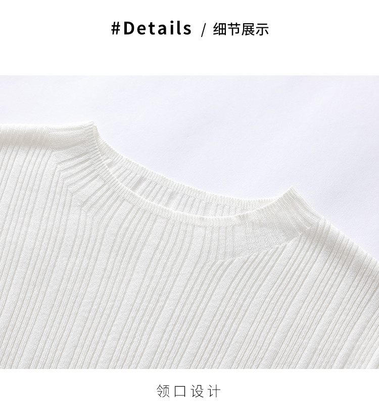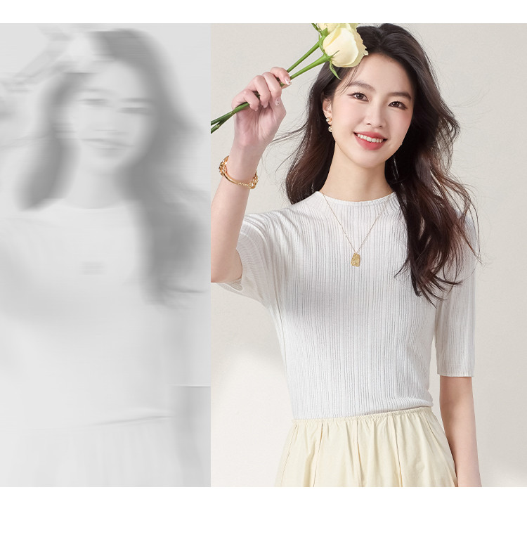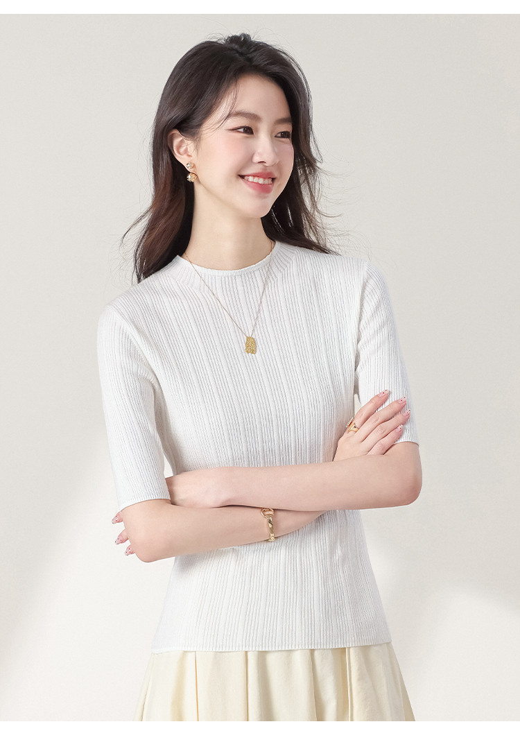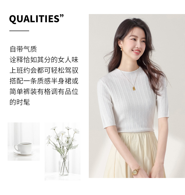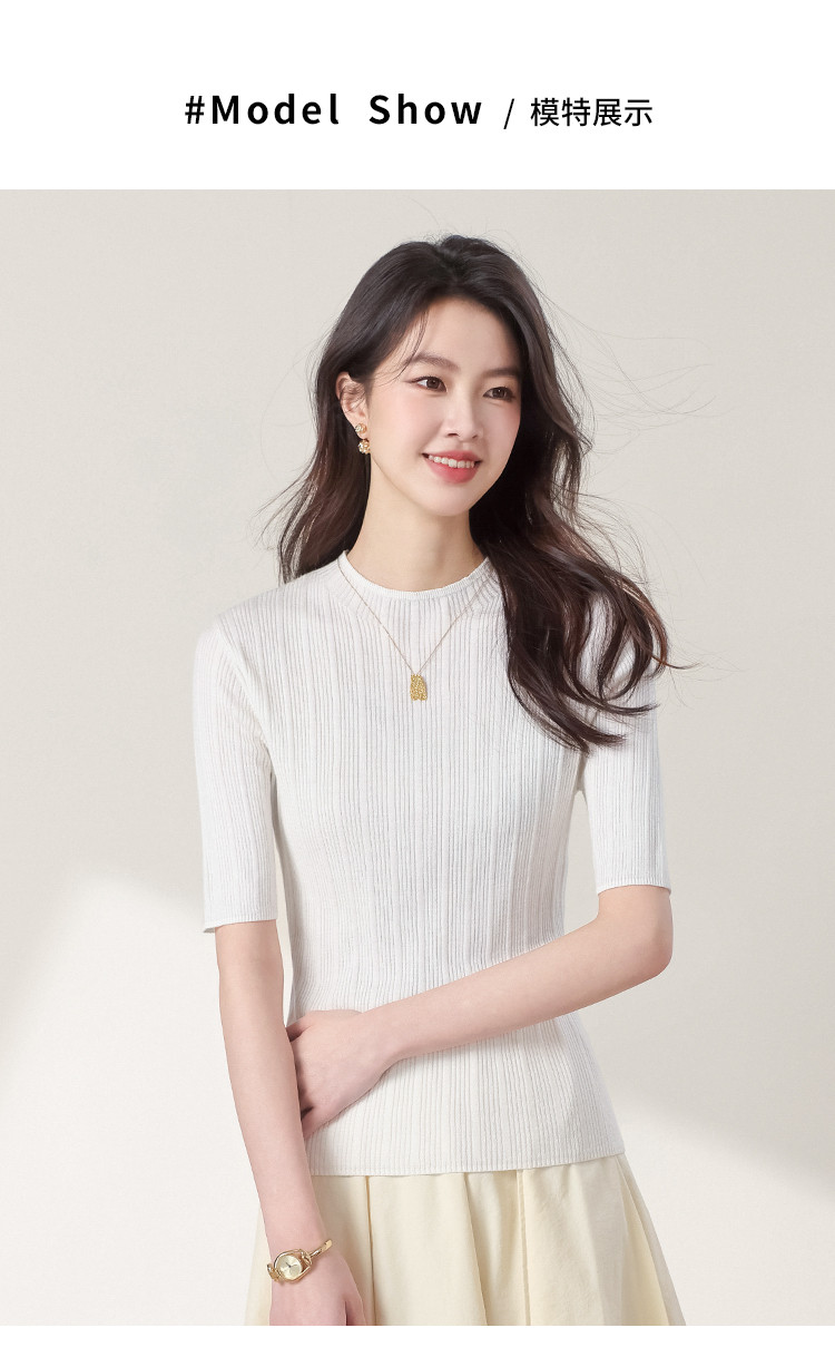 商品名称:含桑蚕丝~圆领纯色抽条舒适短袖T恤简约针织衫女套头薄款打底衫 351699