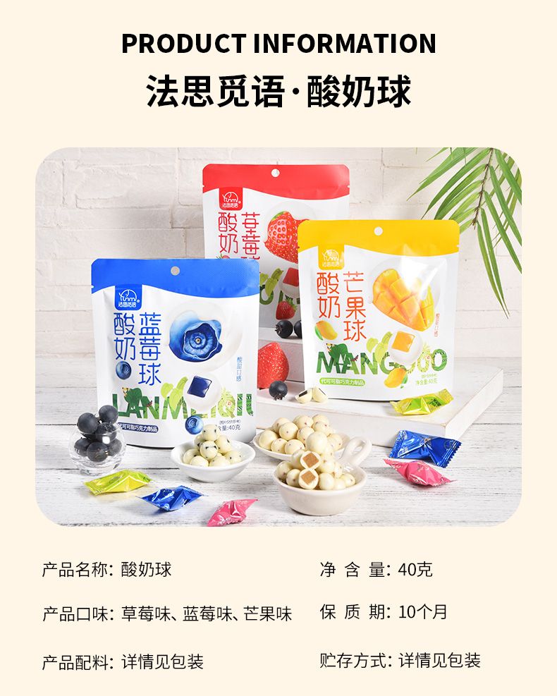 商品名称:法思觅语 酸奶球40g 蓝莓/草莓/芒果/香橙/青柠 解馋零食