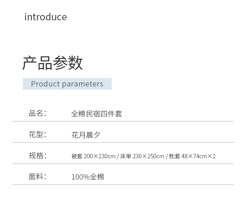 商品名称:KINTHERI/金丝莉花月晨夕全棉民宿床品四件套200*230cm
