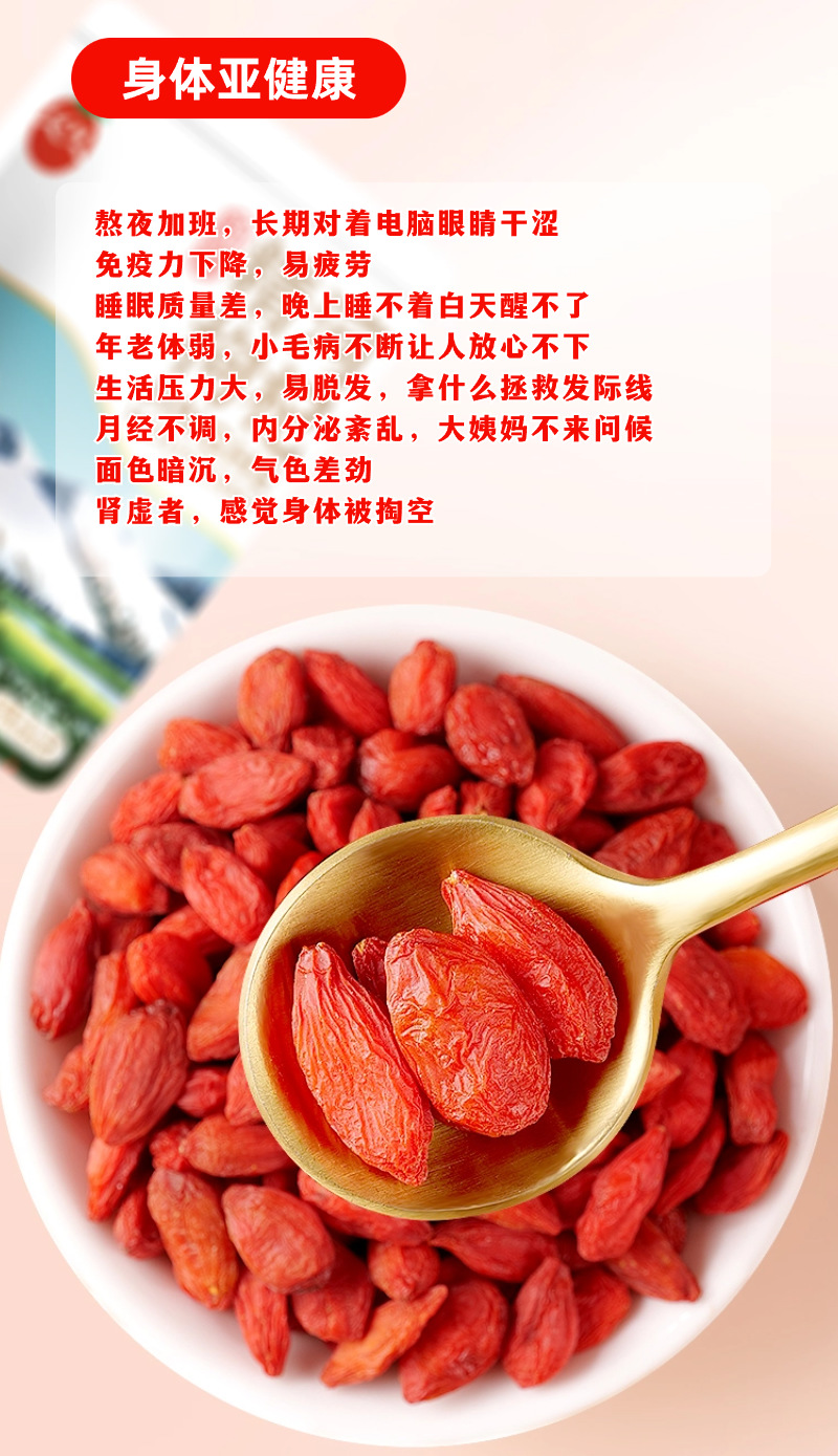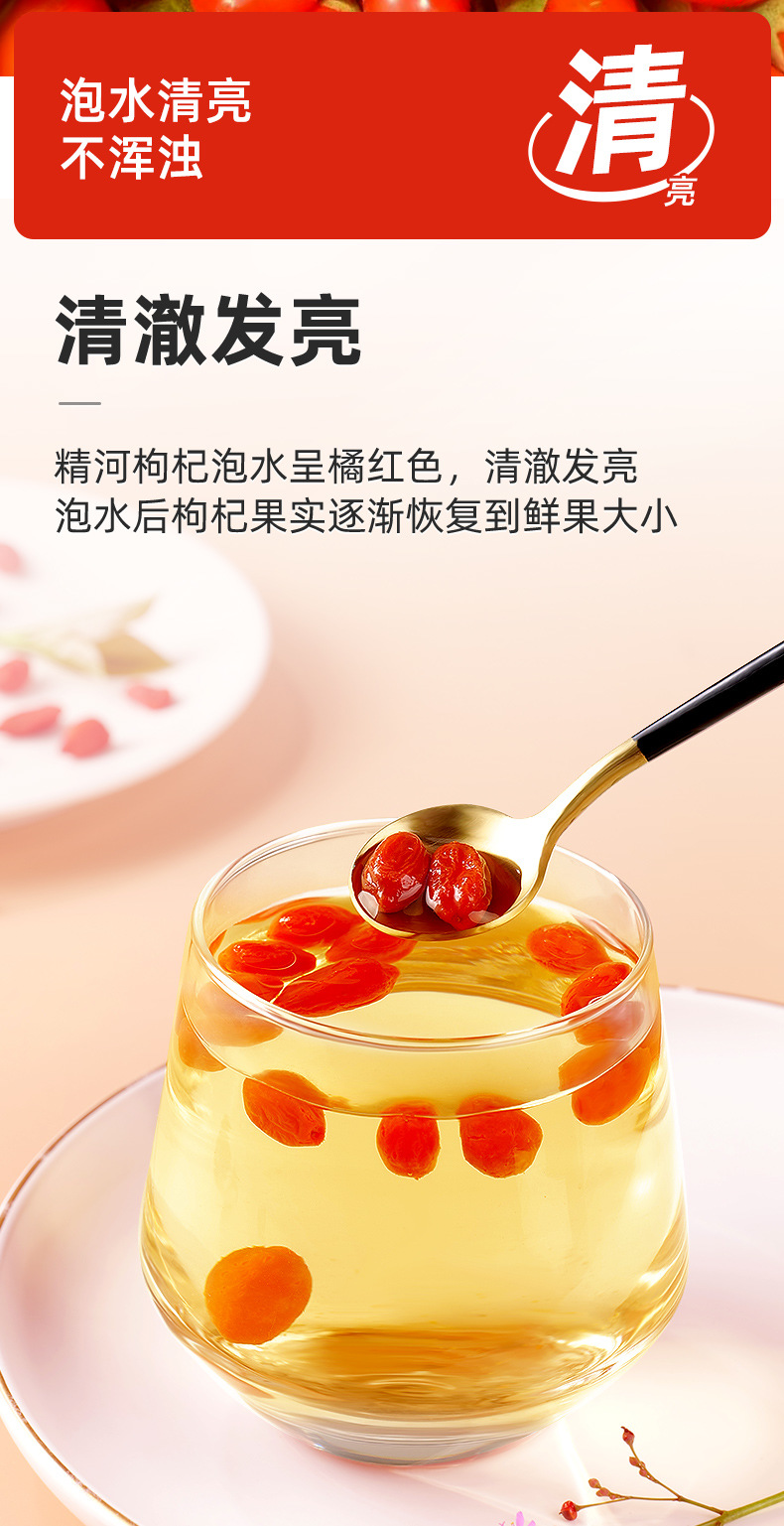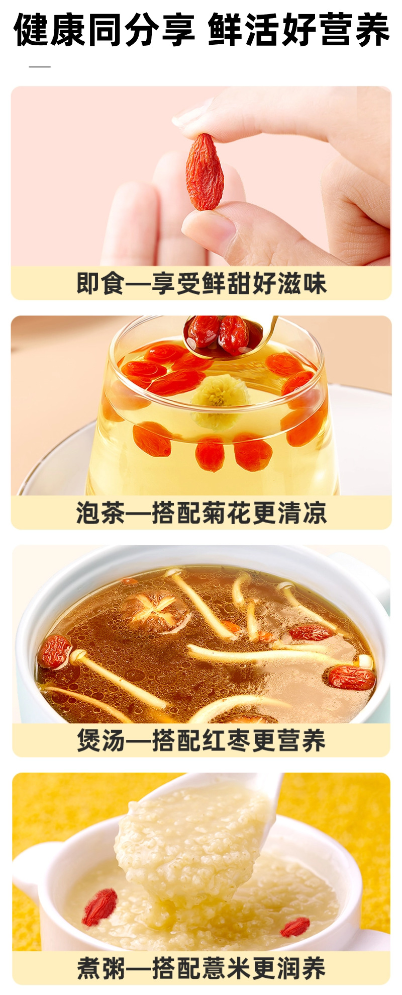 【随时随地 营养刚刚好】 本色不暗沉,枸杞香味浓郁,一“杞”健康。 即食—享受鲜甜好滋味 泡茶—枸杞泡茶温和百搭 煲汤—枸杞配红枣营养丰富 煲粥—枸杞煮粥滋补健康。
