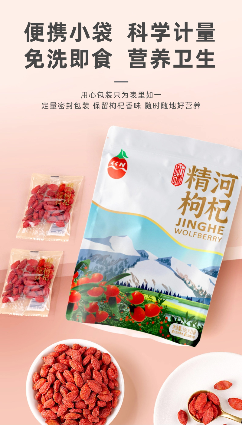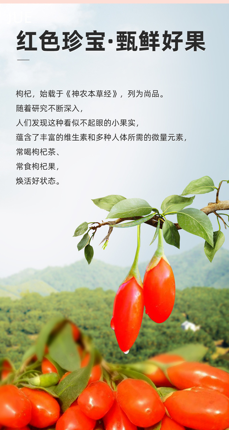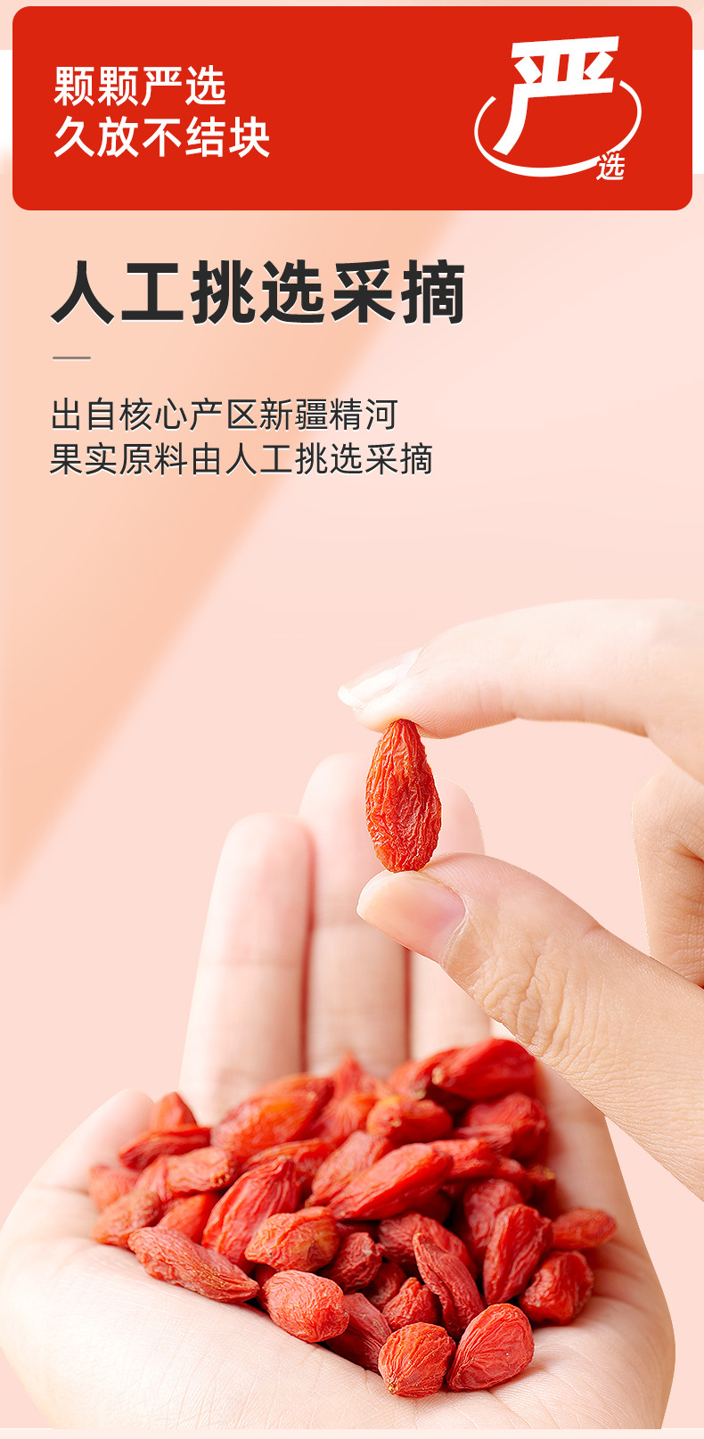 【随时随地 营养刚刚好】 本色不暗沉,枸杞香味浓郁,一“杞”健康。 即食—享受鲜甜好滋味 泡茶—枸杞泡茶温和百搭 煲汤—枸杞配红枣营养丰富 煲粥—枸杞煮粥滋补健康。