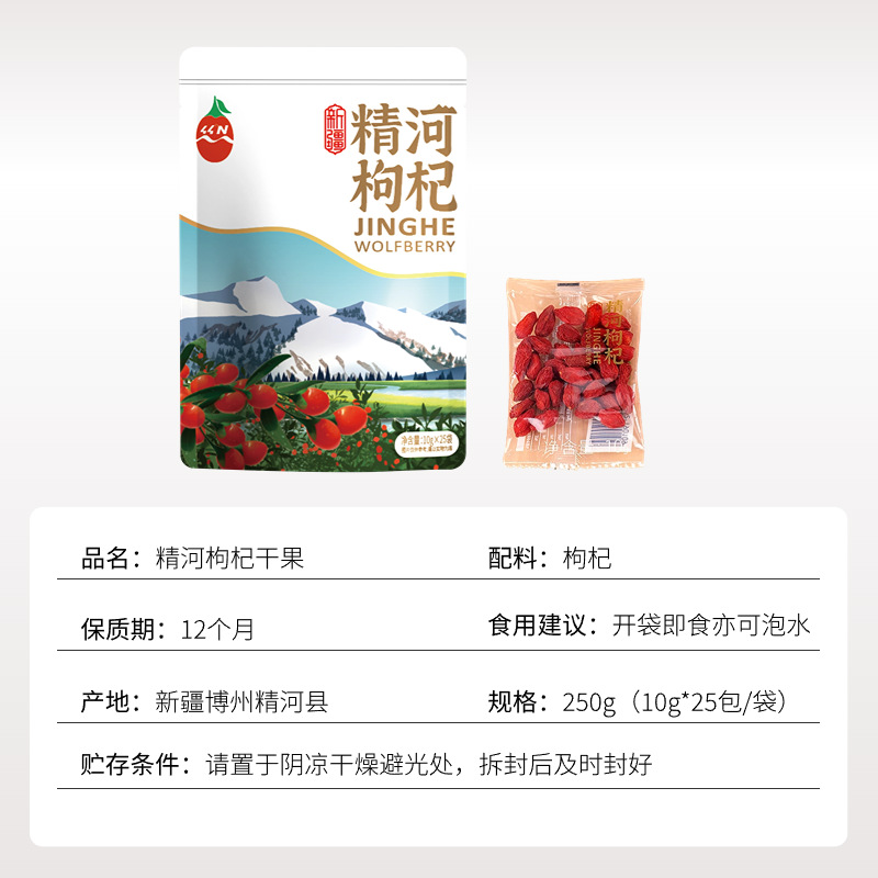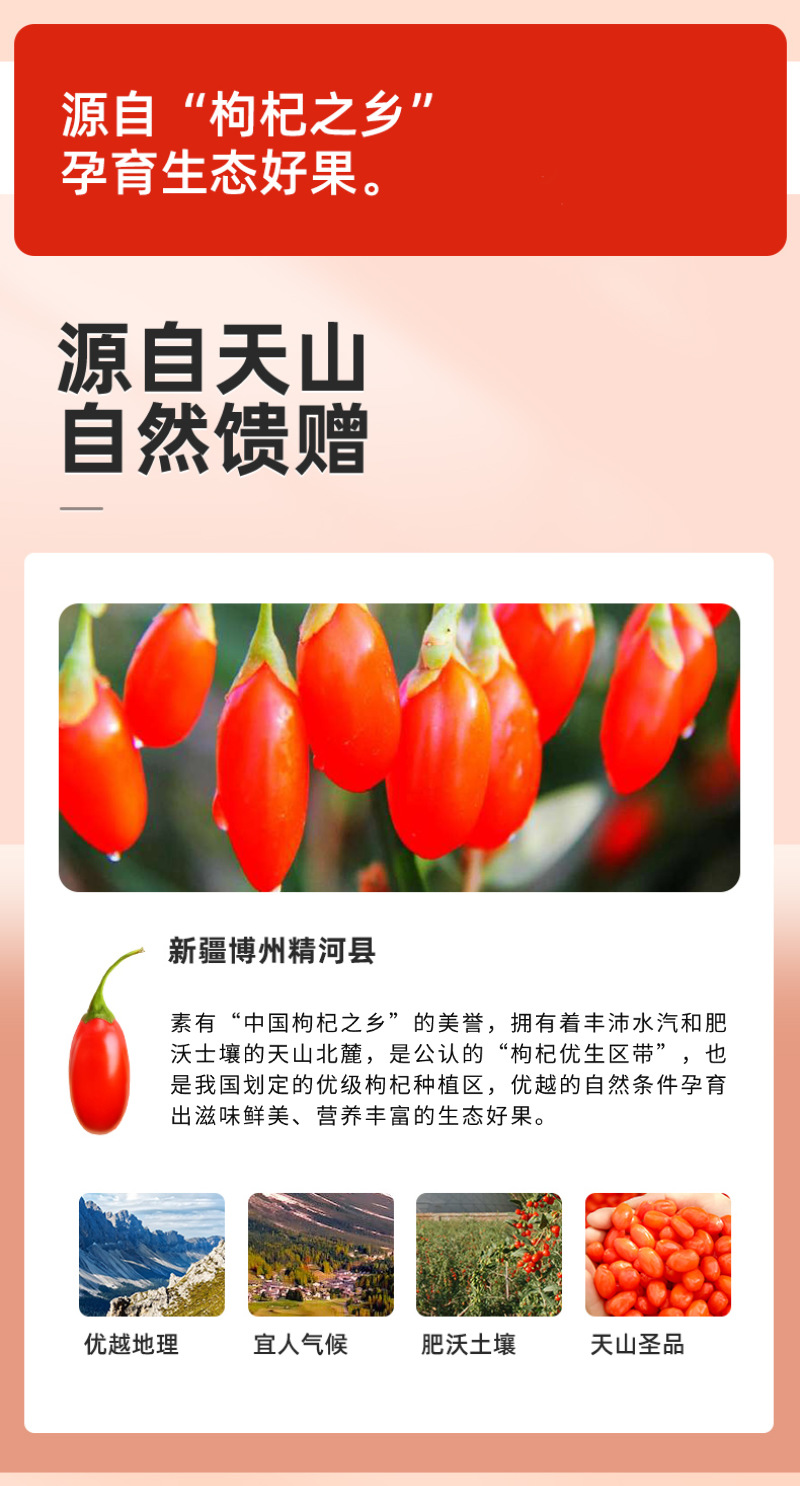 【品尝鲜美营养】 源自“中国枸杞之乡”新疆精河 坚持天然种植,天山雪水,孕育新果 传统晾晒,保留原始营养,保留“太阳味道”较高程度的保留各种微量元素 氨基酸、膳食纤维、胡萝卜素、维生素C、维生素E、蛋白质、钙、锌枸杞多糖等。