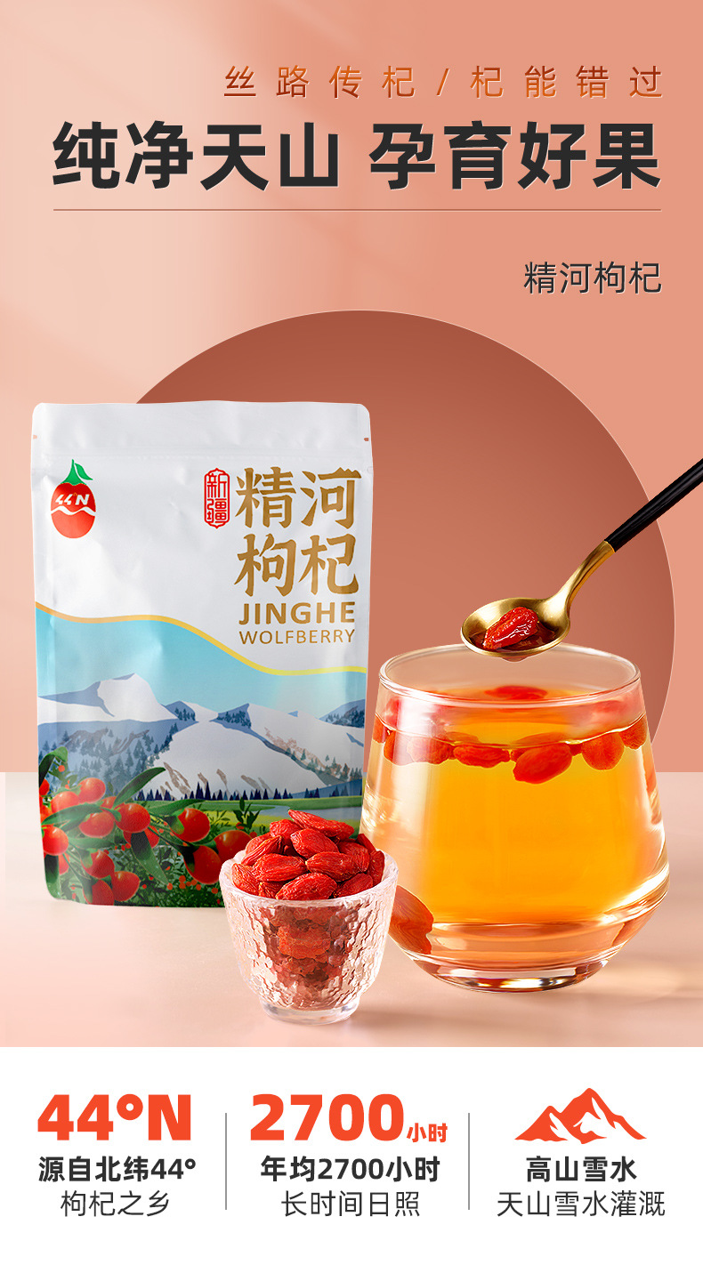 【新疆精河“中国枸杞之乡”】 北纬44°黄金自然带,枸杞生长的天堂 富含矿物质,24小时全程,北纬44°枸杞 原生态土壤开垦,雪山水灌溉 人工监测,生长的天堂,科学化管理种植。