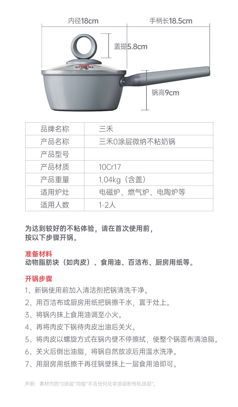 商品名称:SANHO/三禾18cm0涂层微纳不粘奶锅LN18S1