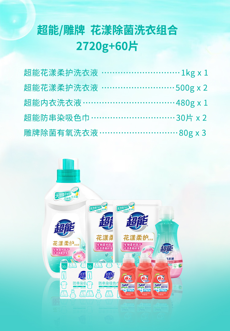 商品名称:【京东/顺丰配送】超能/雕牌花漾除菌洗衣组合2720g+60片