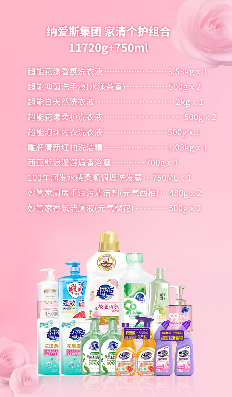 商品名称:【京东/顺丰配送】超能/雕牌/西亚斯/100年润发/妙管家家清个护组合11720g+750ml