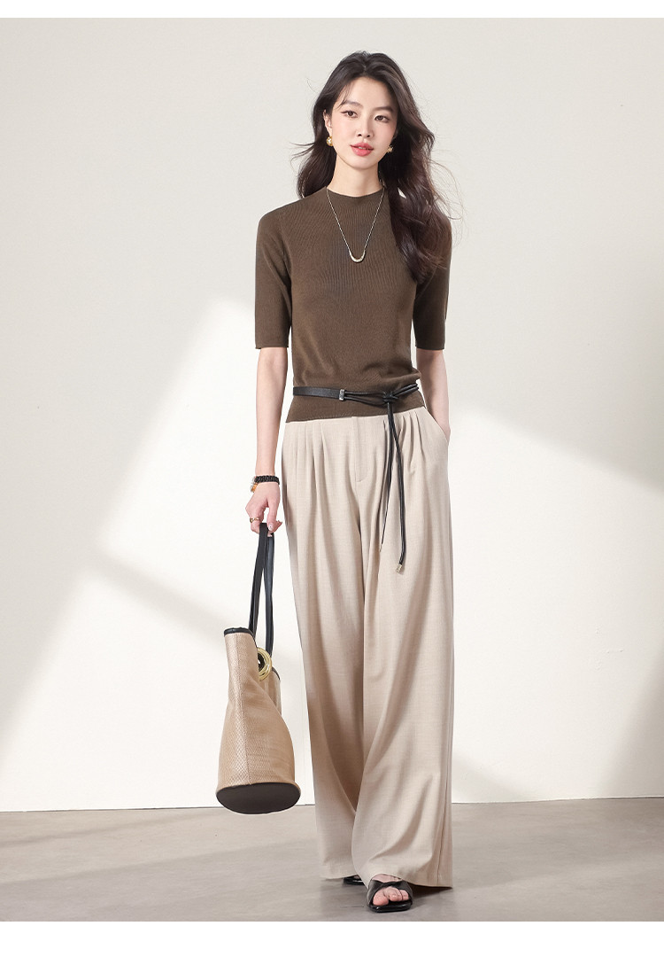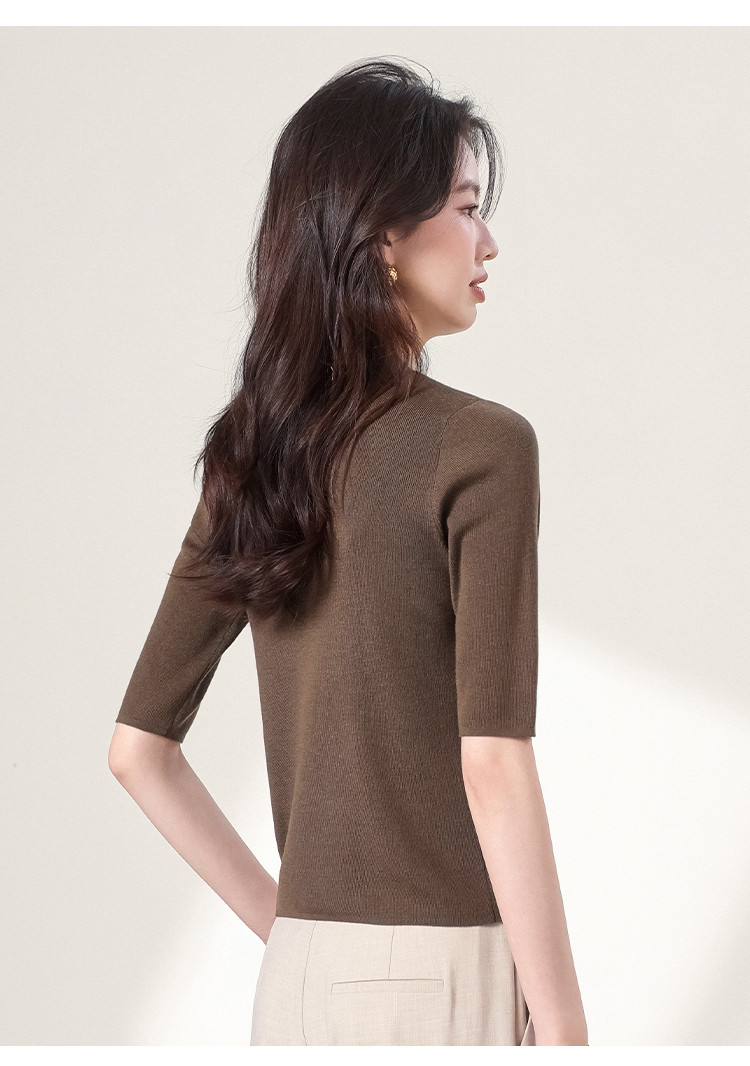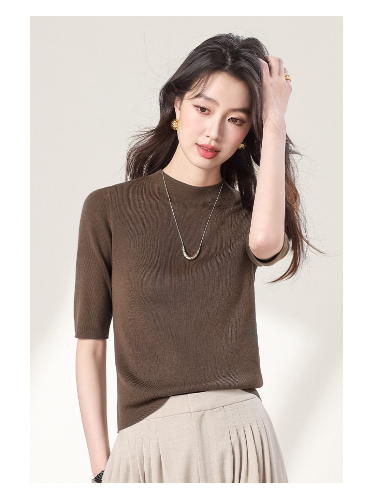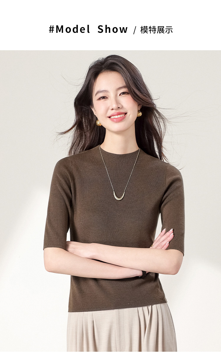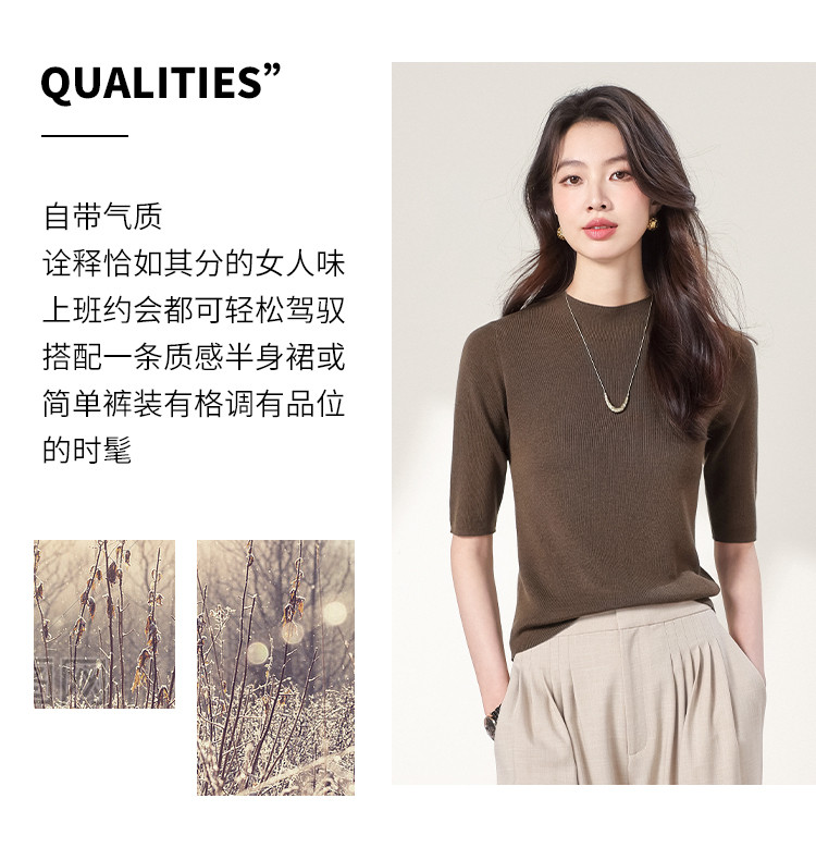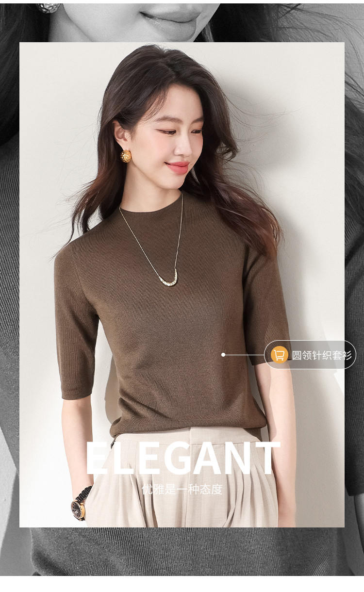 商品名称:含羊毛~圆领纯色针织衫女套头百搭休闲五分袖打底衫春夏简约T恤 786451