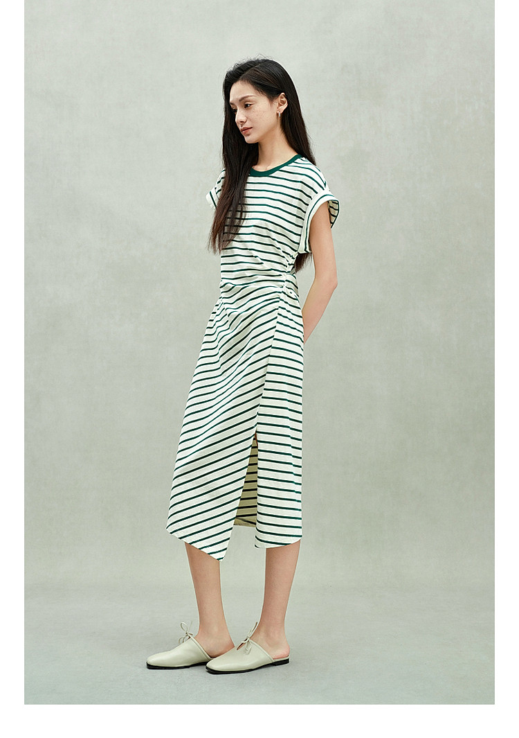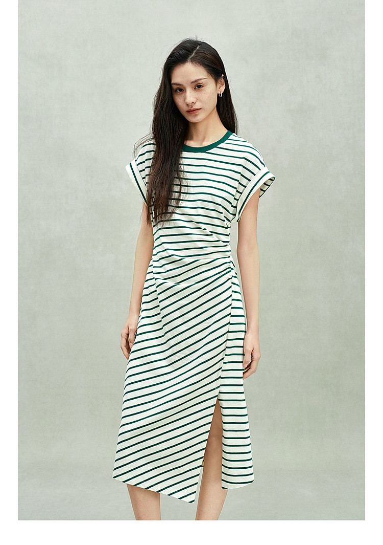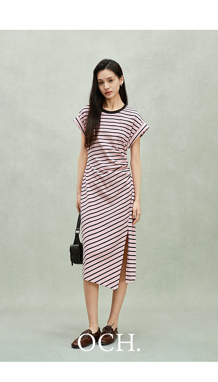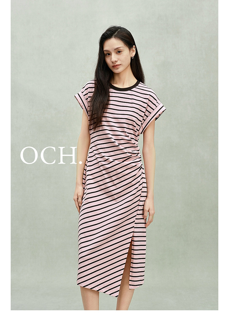 限定系列OCH.春装 收褶开衩休闲纯棉条纹不规则连衣裙 998415