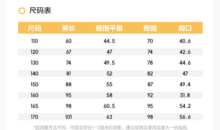 | 尺码 | 身高(cm) | 腰围(cm) | 裤长(cm) | 臀围(cm) | 适合年龄 | 号型 |