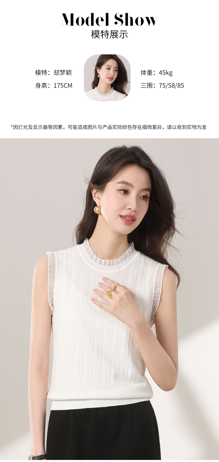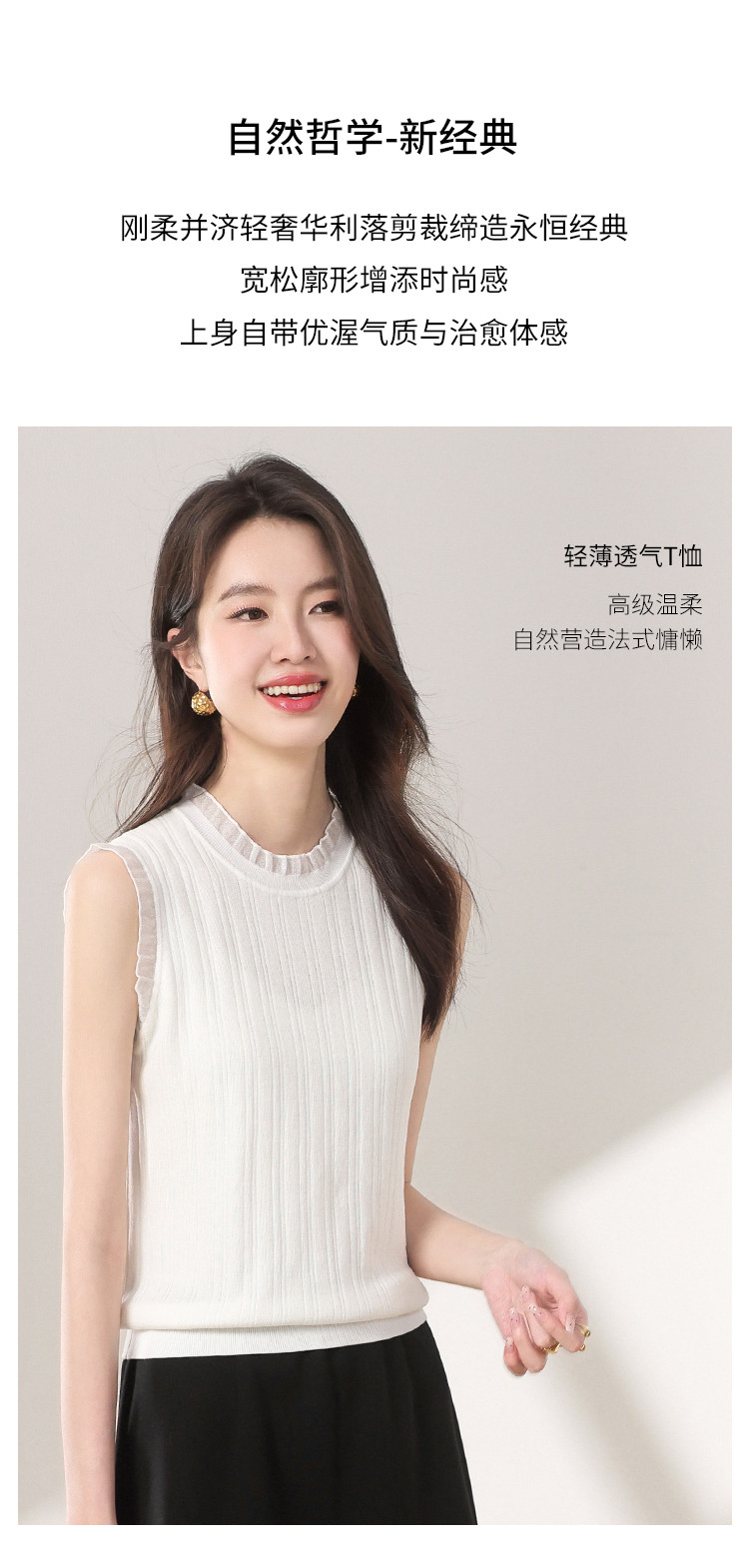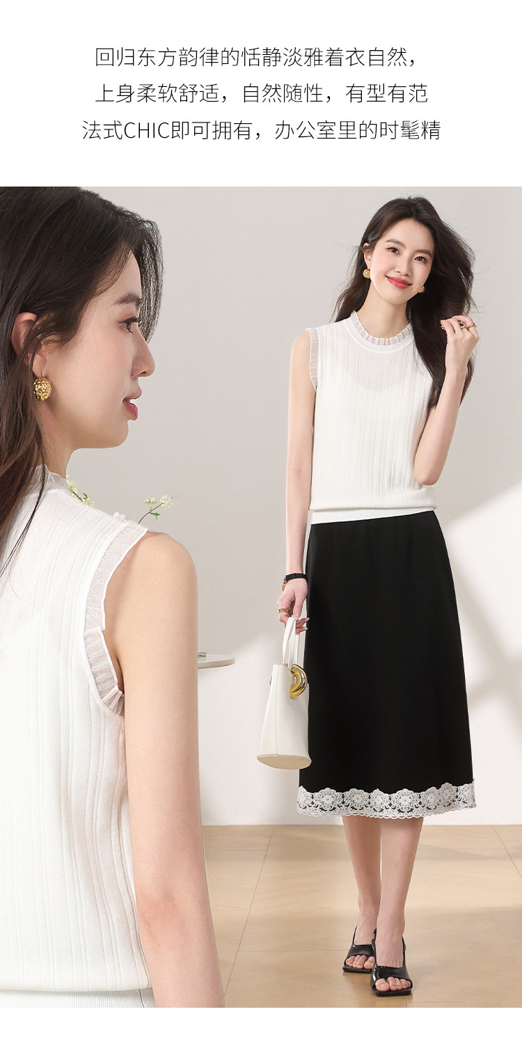 商品名称:【含桑蚕丝】蕾丝边抽条简约无袖T恤春夏显瘦针织衫女背心马甲 495571
