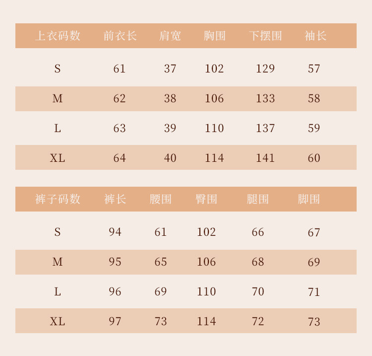 | 尺码 | 肩宽(cm) | 袖长(cm) | 上装号型 | 下装号型 | 衣长(cm) | 腰围(cm) | 裤长(cm) | 臀围(cm) | 胸围(cm) | 号型 |
