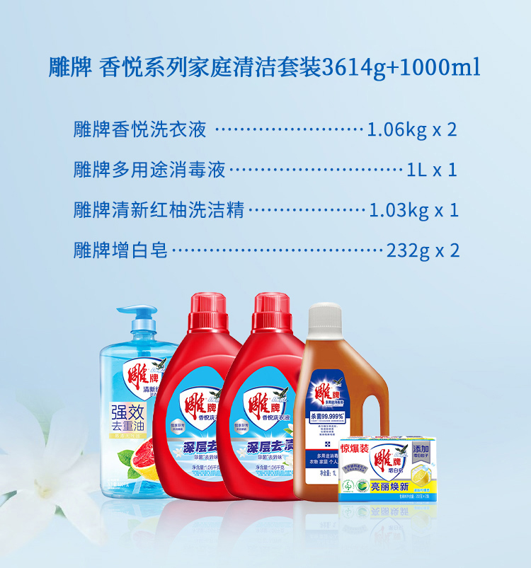 商品名称:【京东/顺丰配送】雕牌香悦系列家庭清洁套装3614g+1000ml