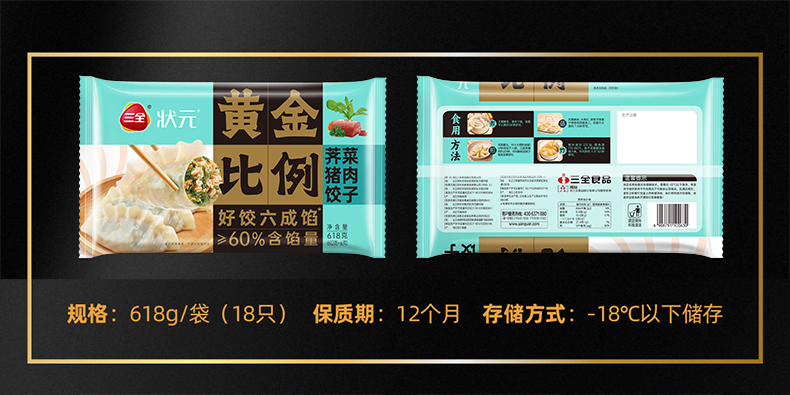 商品名称:【京东/顺丰配送】三全状元黄金比例荠菜猪肉速冻饺子618g*3袋