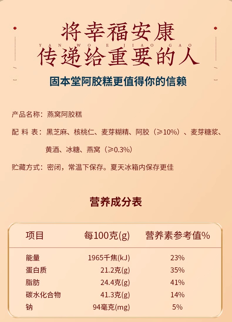 商品名称:固本堂燕窝阿胶糕礼盒200g*2盒