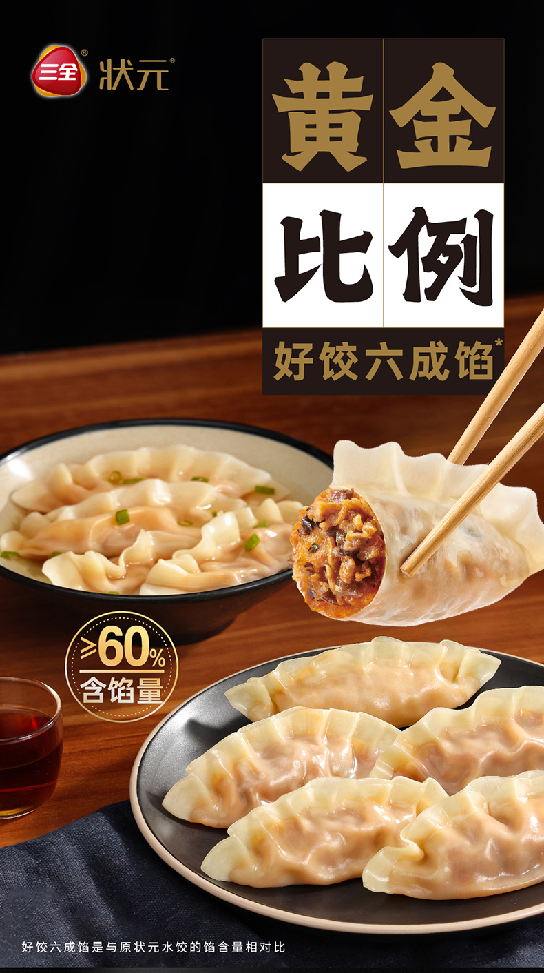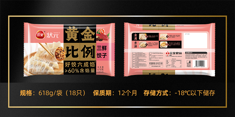 商品名称:【京东/顺丰配送】三全状元黄金比例三鲜速冻饺子618g*3袋