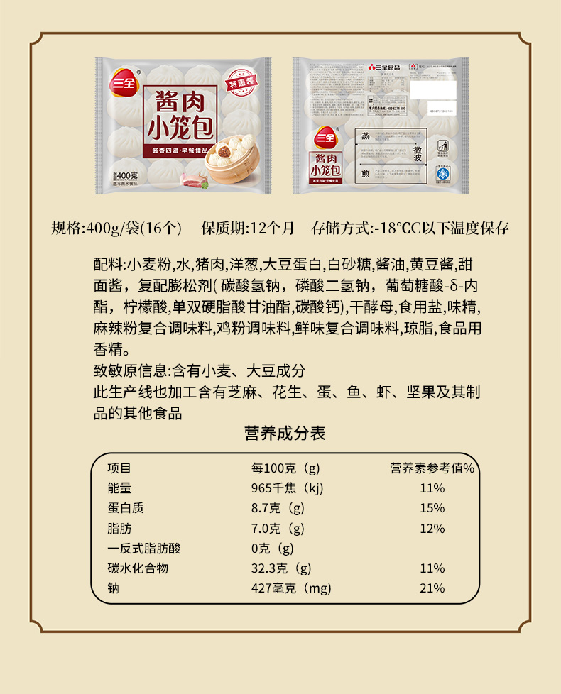 商品名称:【京东/顺丰配送】三全发面酱肉小笼包400g*3袋