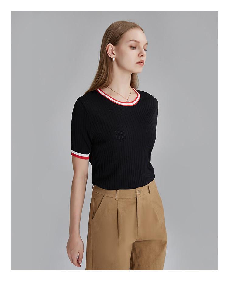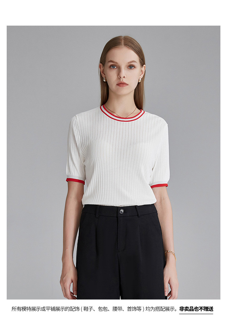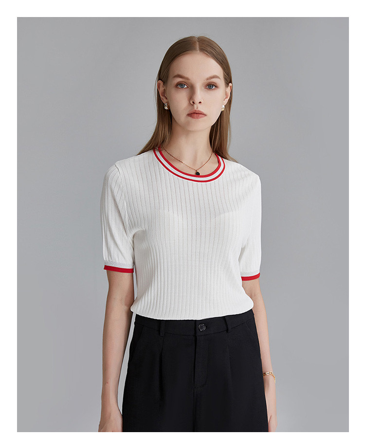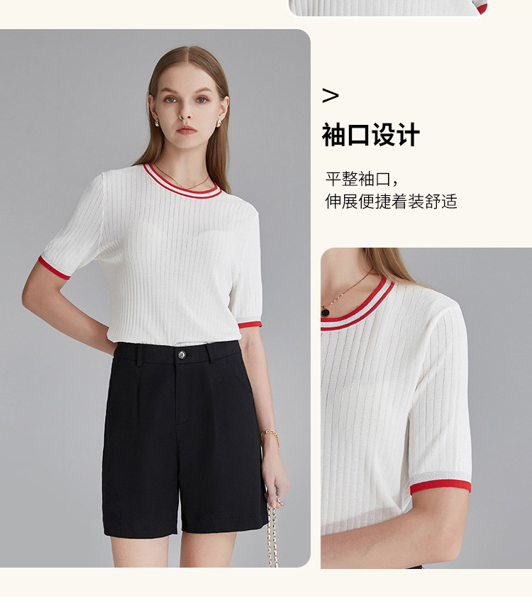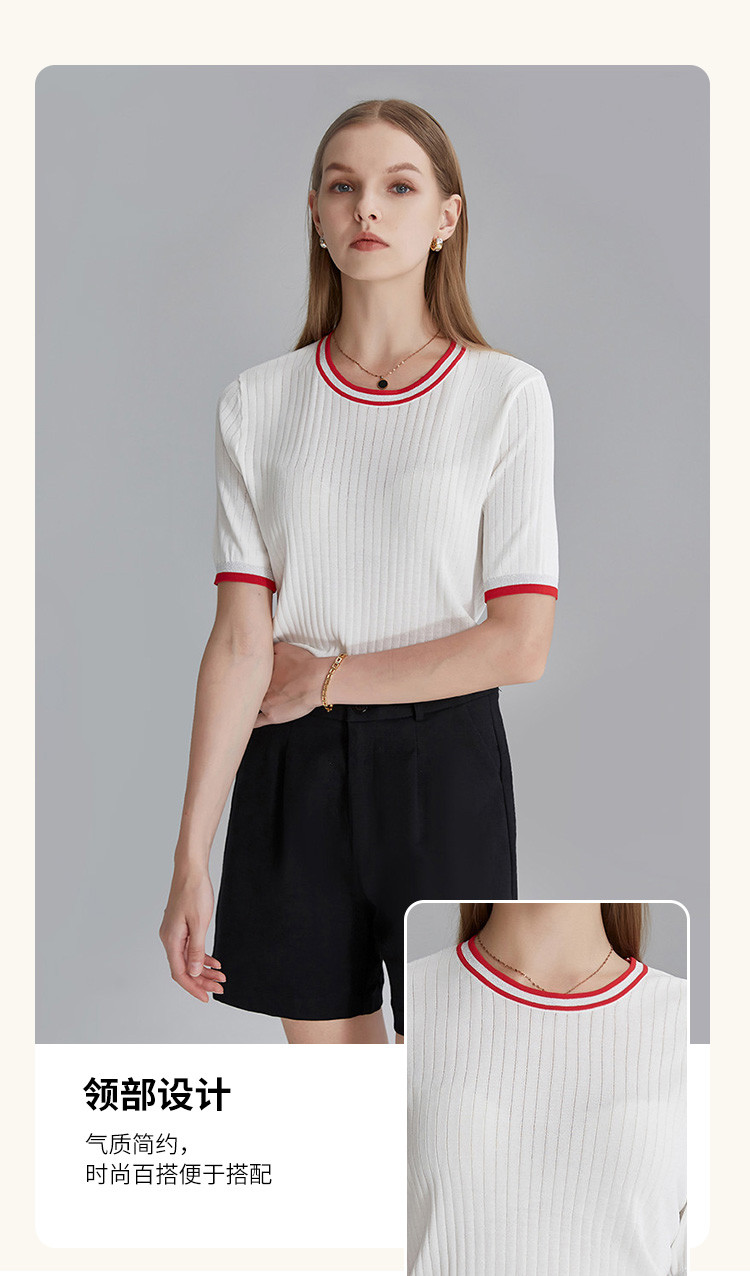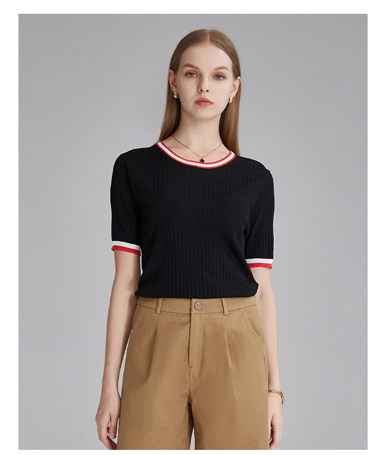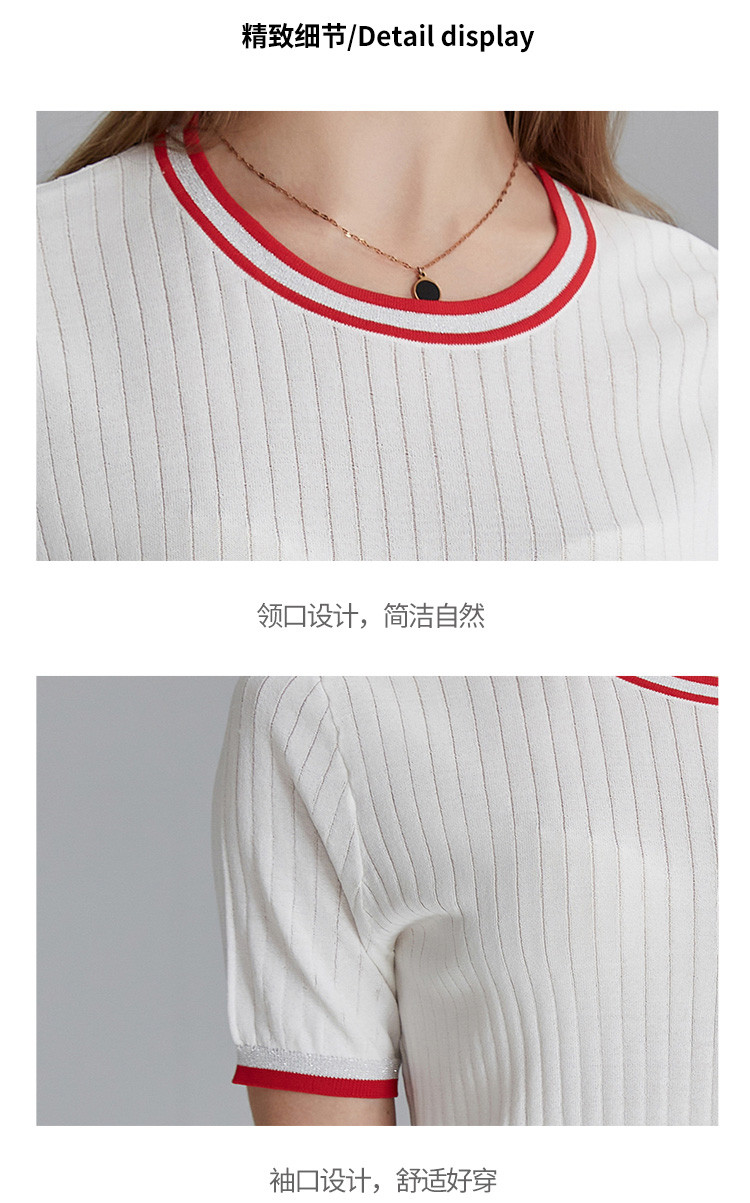 商品名称:春秋新款日常通勤条纹撞色针织T恤女式减龄内搭时尚百搭短袖上衣 357599
