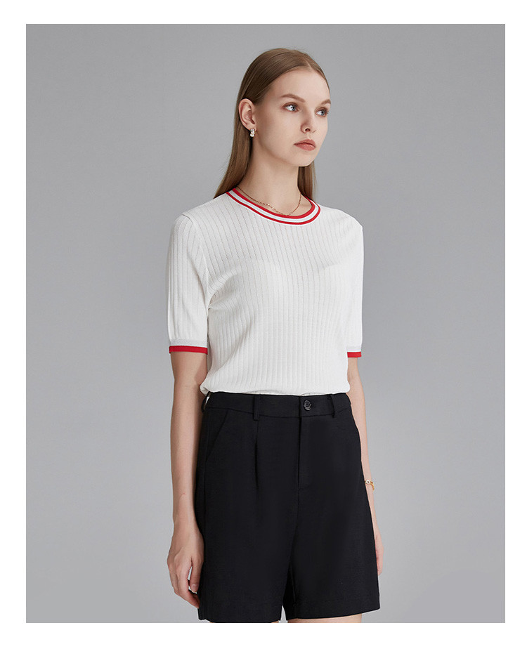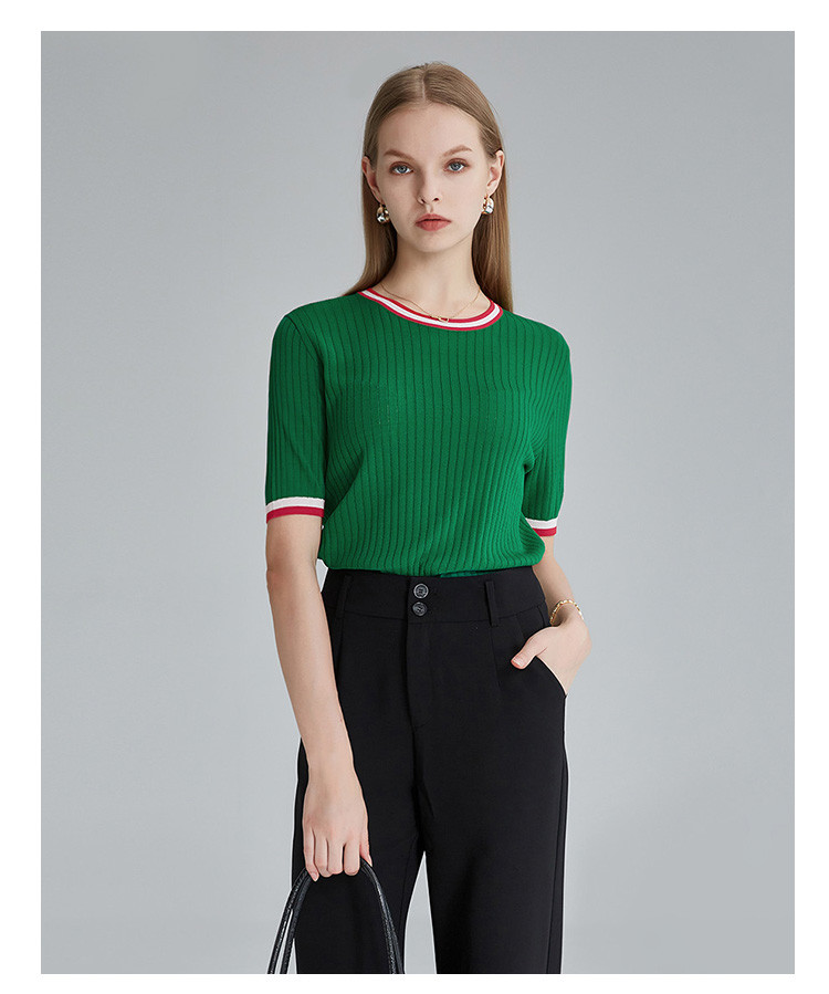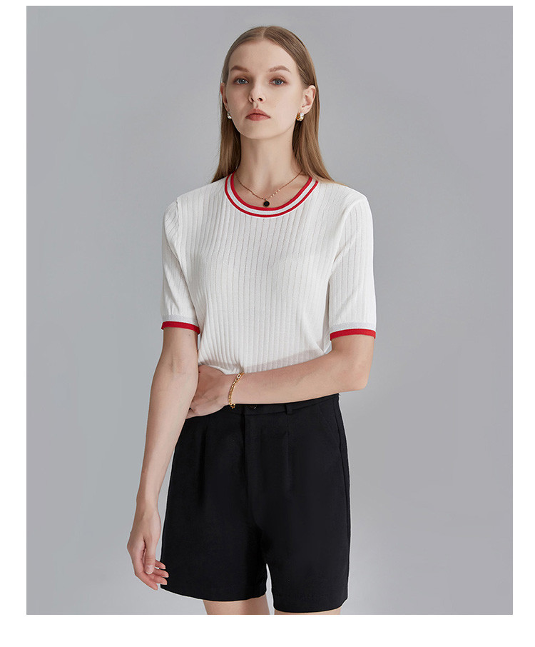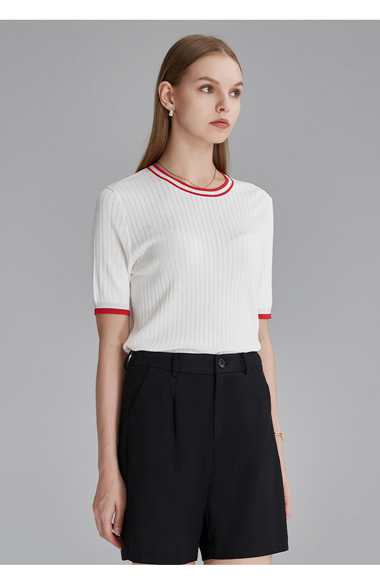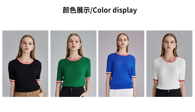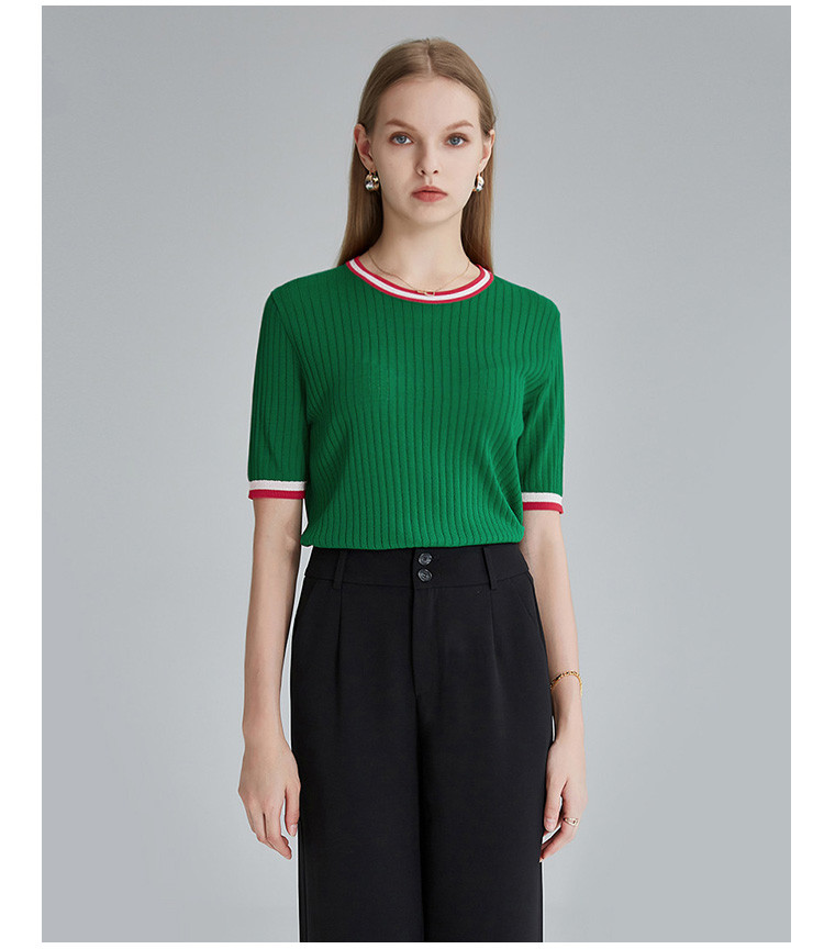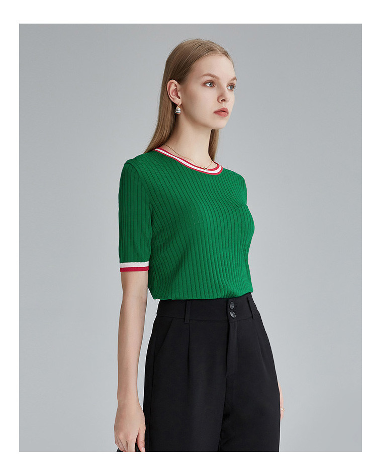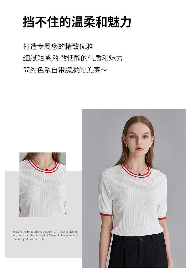 商品名称:春秋新款日常通勤条纹撞色针织T恤女式减龄内搭时尚百搭短袖上衣 357599