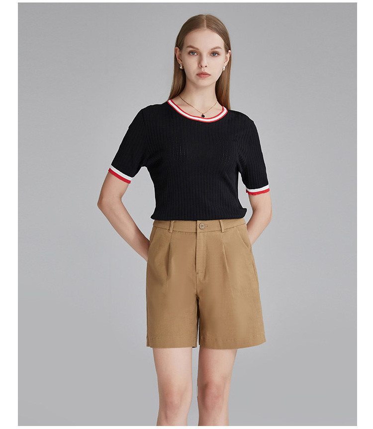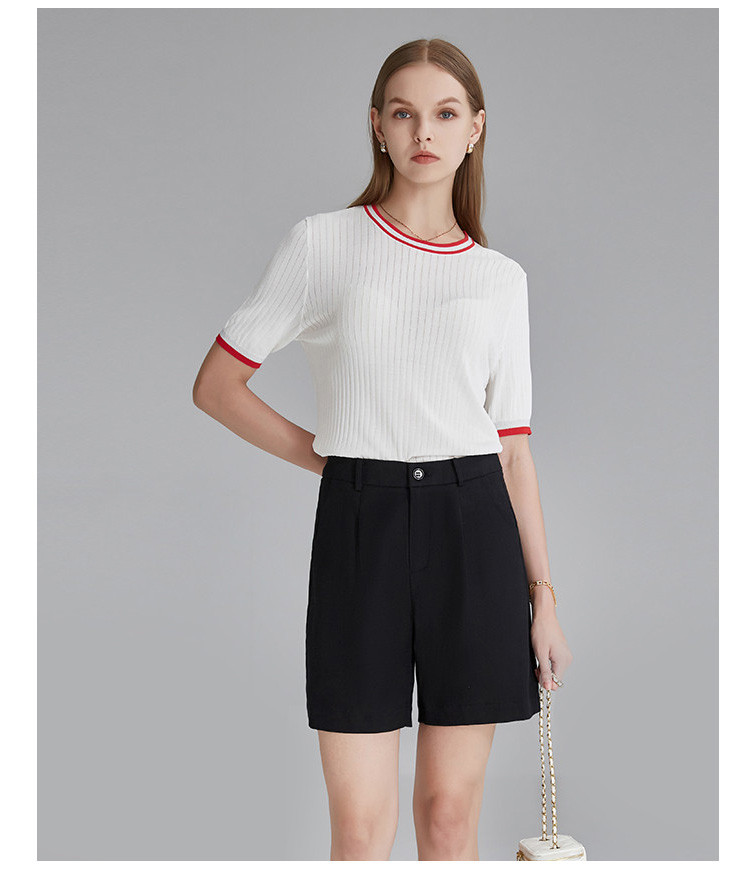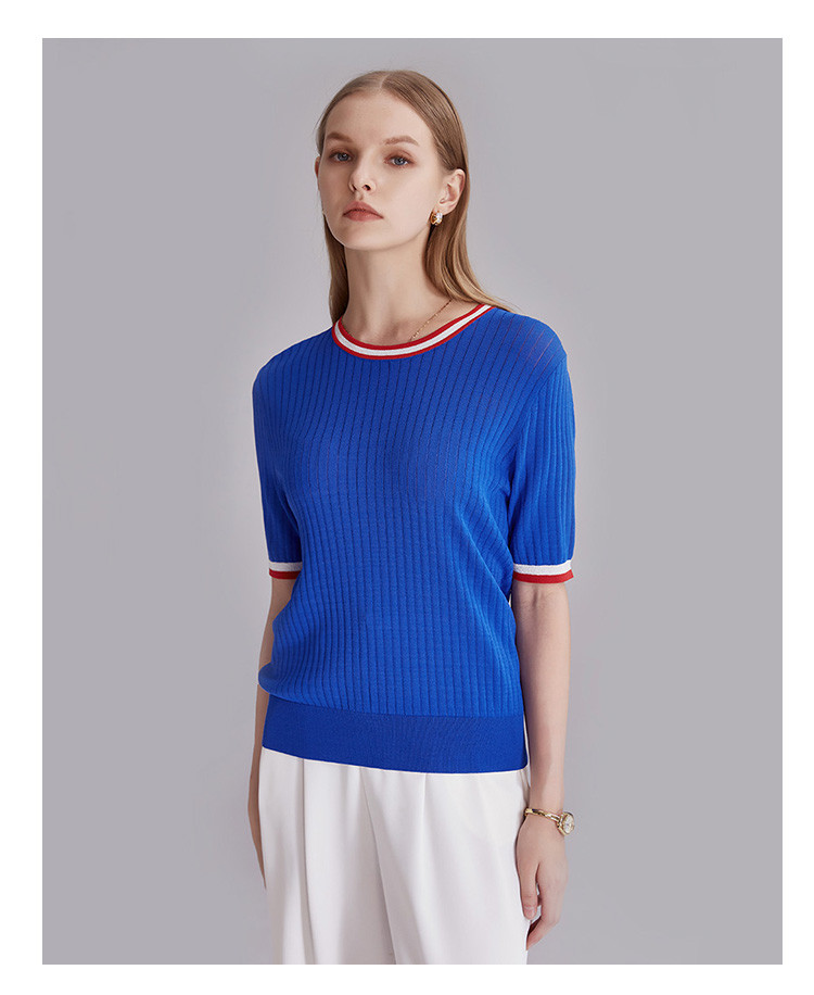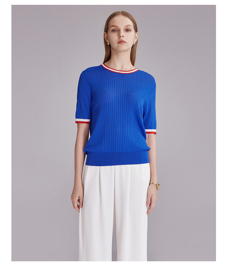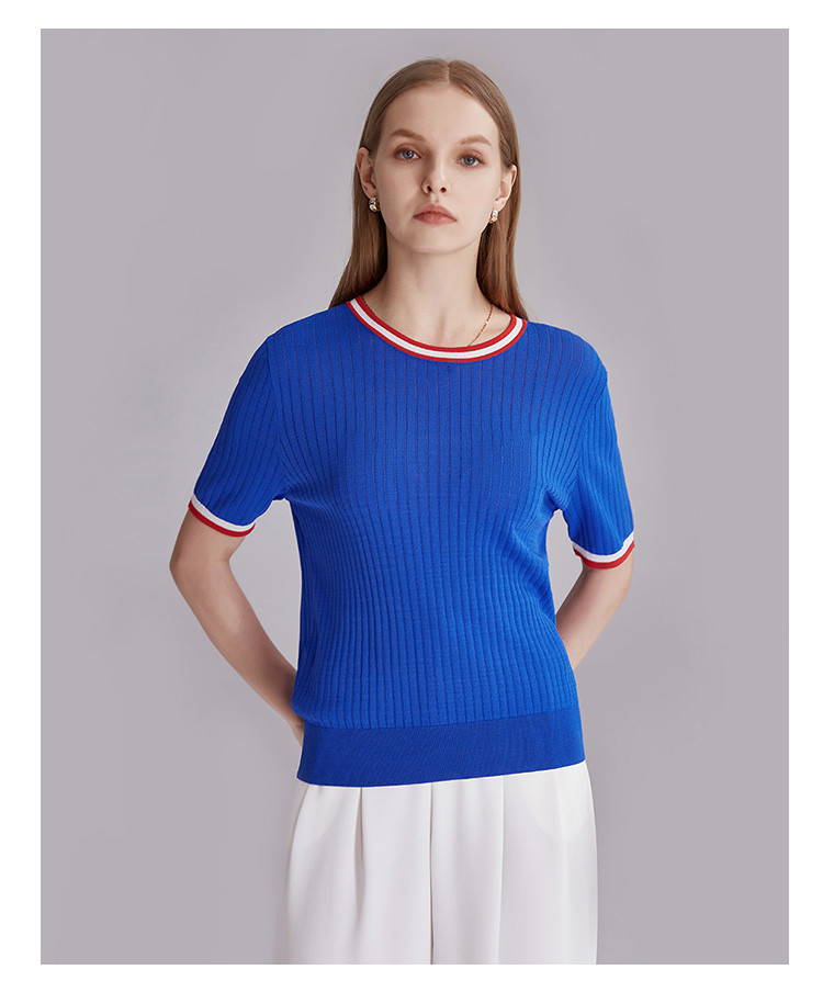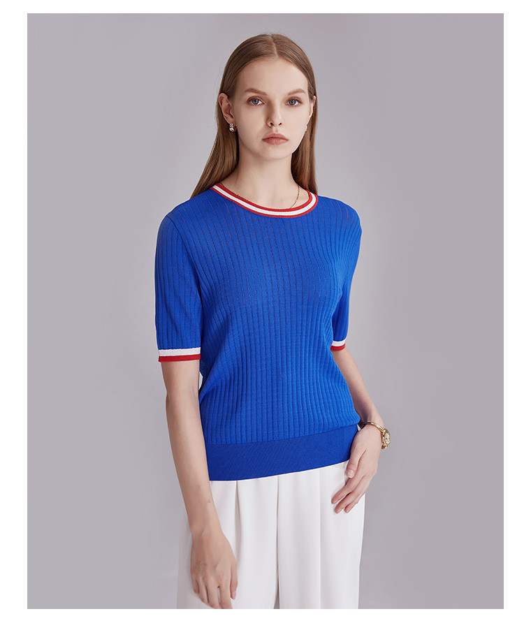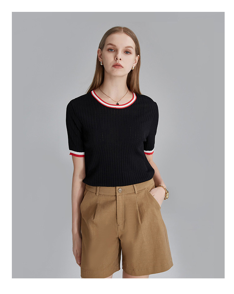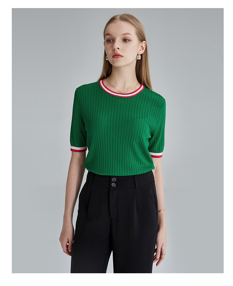 商品名称:春秋新款日常通勤条纹撞色针织T恤女式减龄内搭时尚百搭短袖上衣 357599