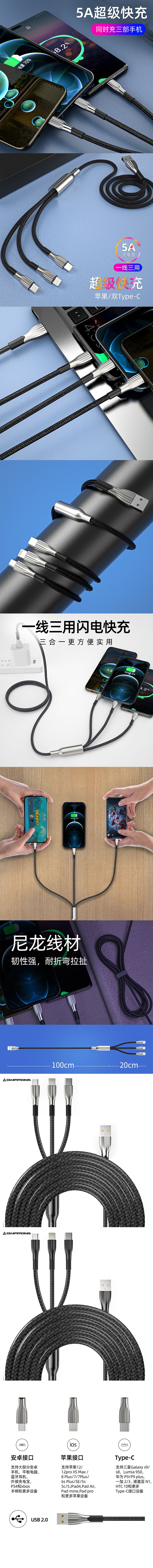 商品名称:错山 锌合金三合一超级快充数据线Z-04黑灰色