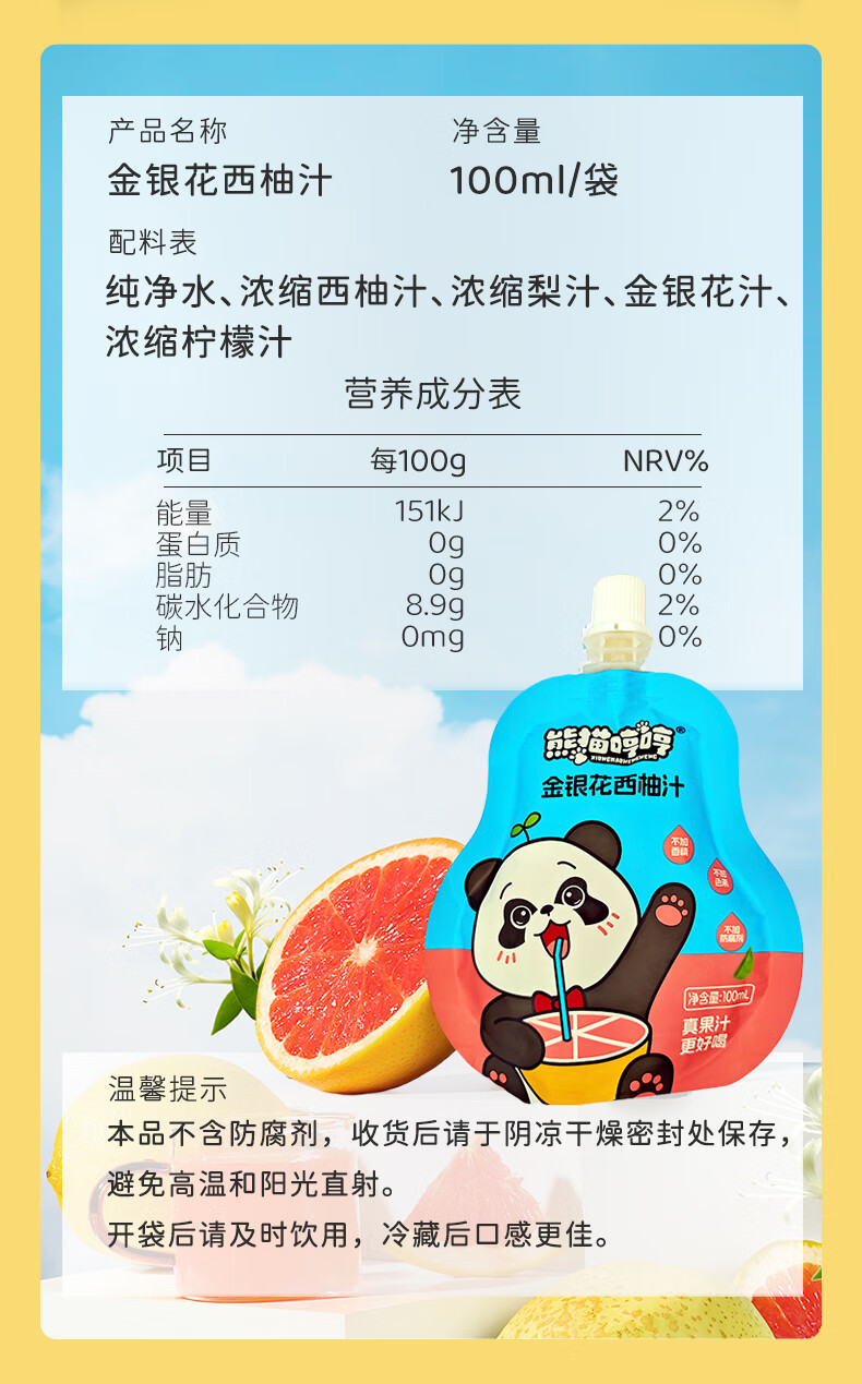 商品名称:熊猫哼哼金银花西柚汁礼盒100ml*12*2箱