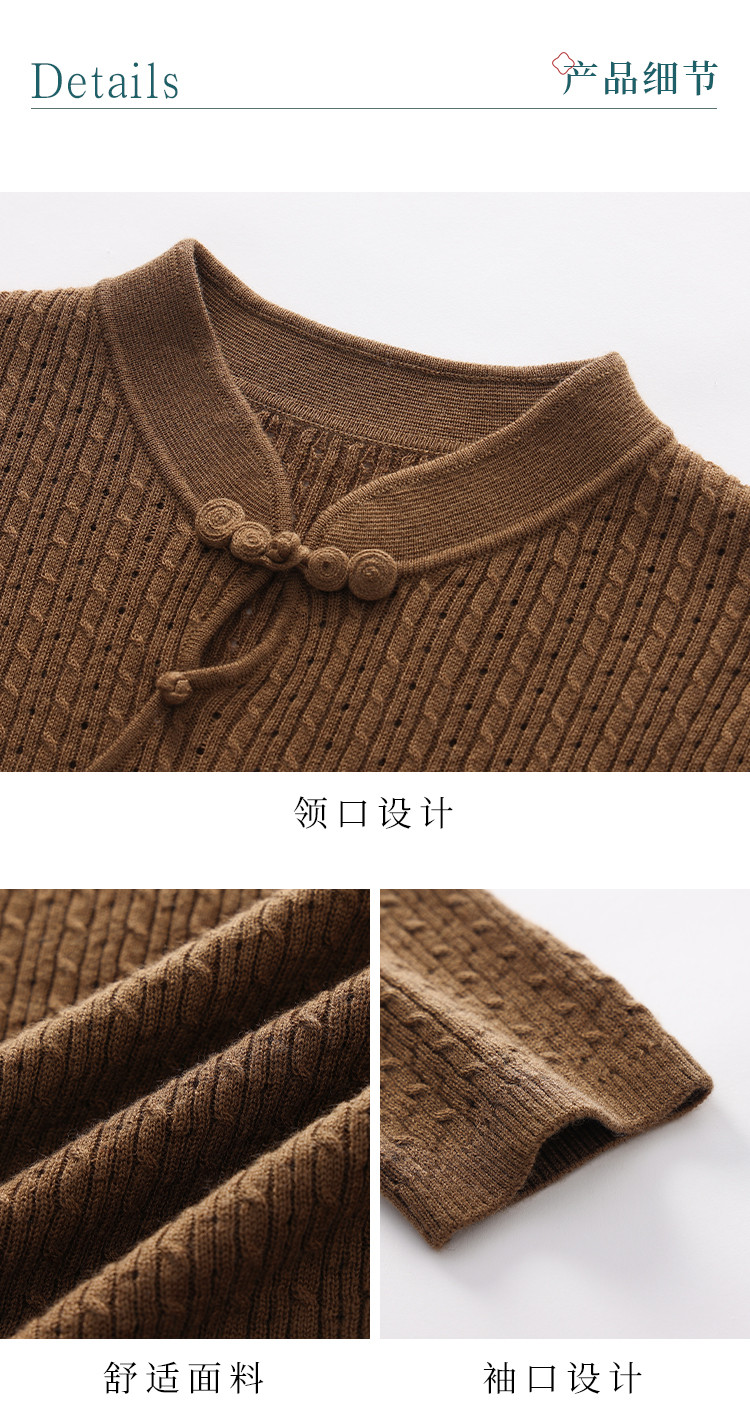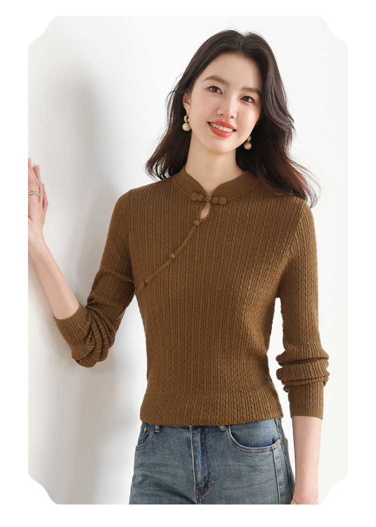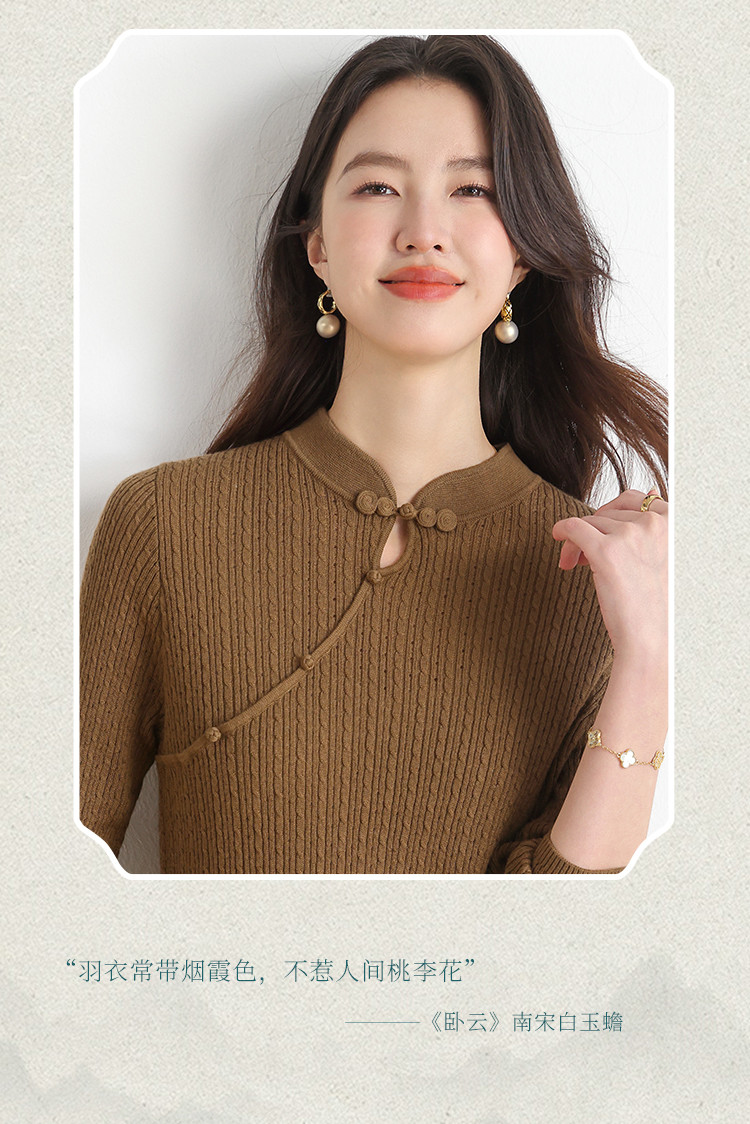 【新中式】旗袍领盘扣针织衫女套头纯色绞花时尚羊毛打底衫线衫春 362003