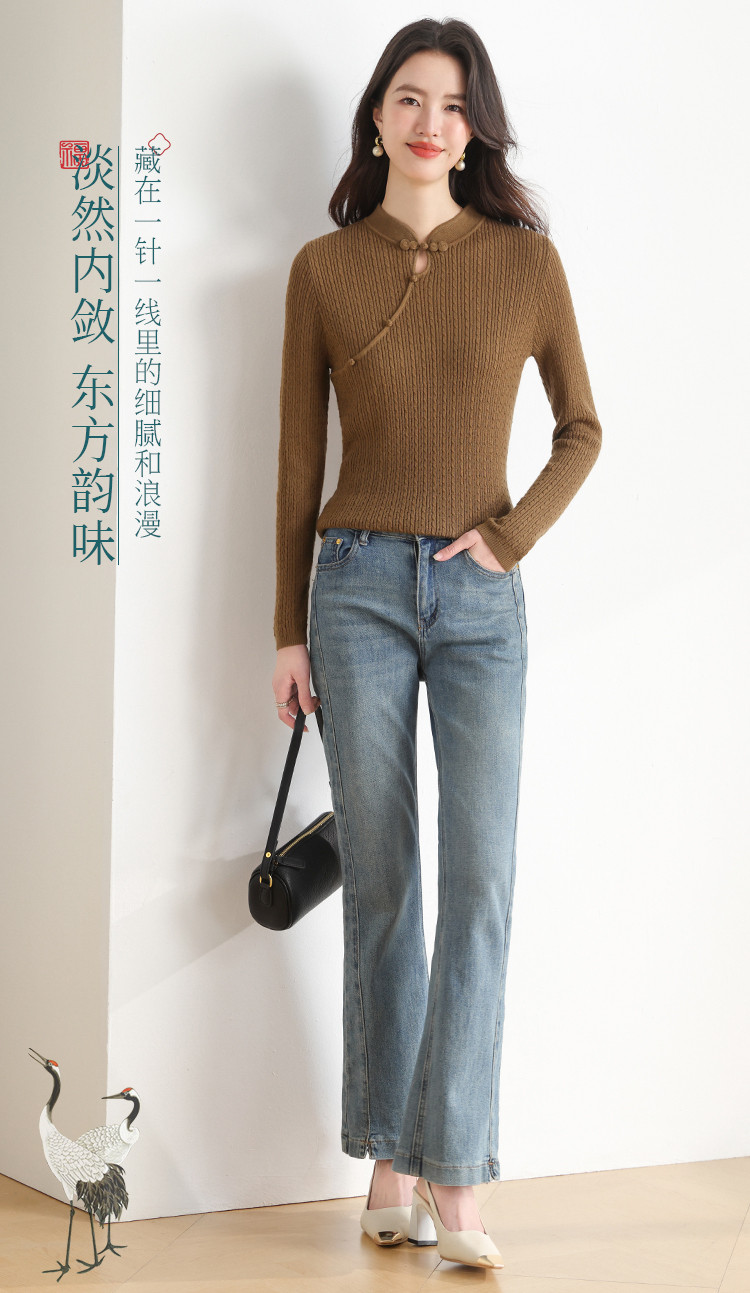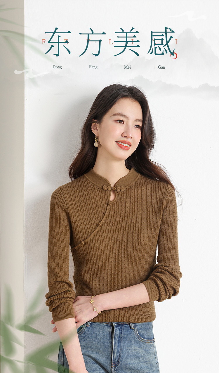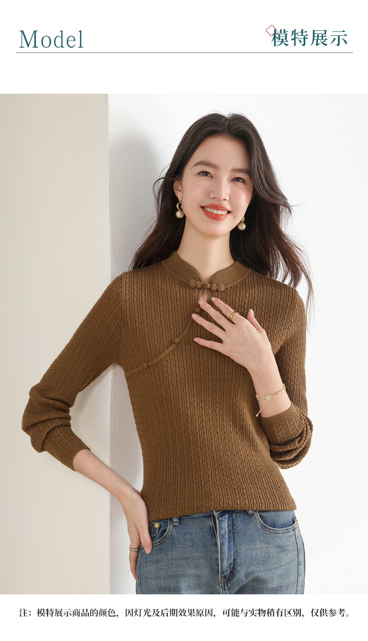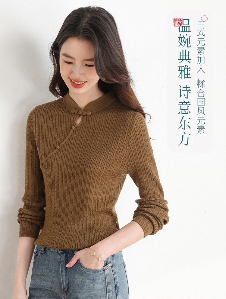 商品名称:【新中式】旗袍领盘扣针织衫女套头纯色绞花时尚羊毛打底衫线衫春 362003