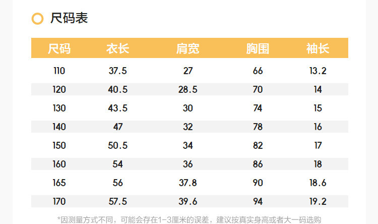 | 尺码 | 衣长(cm) | 肩宽(cm) | 身高(cm) | 袖长(cm) | 适合年龄 | 胸围(cm) | 号型 |