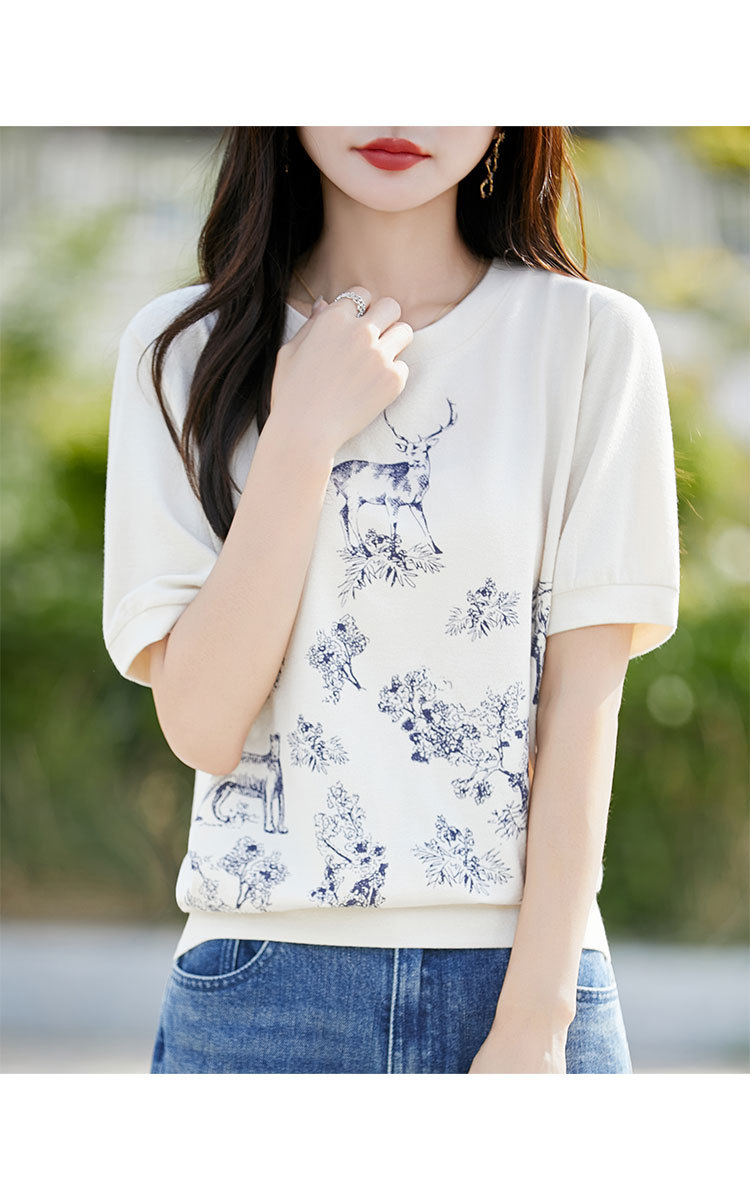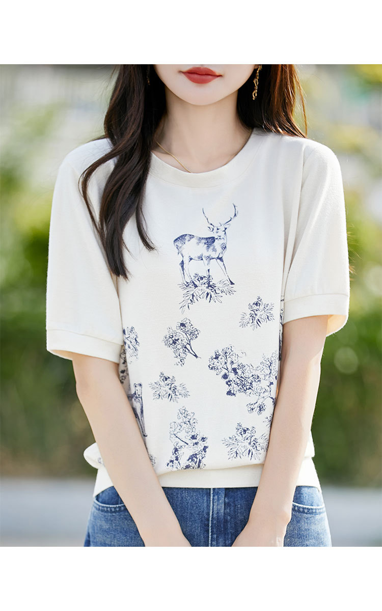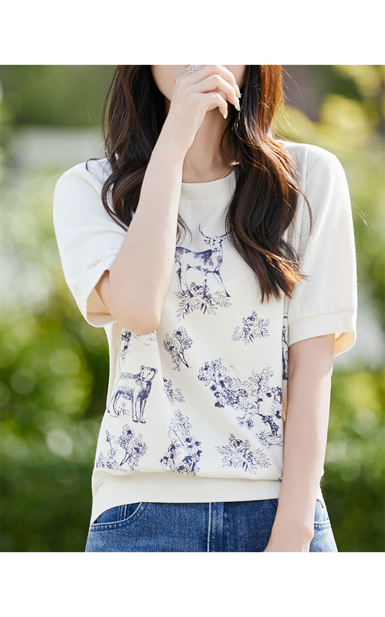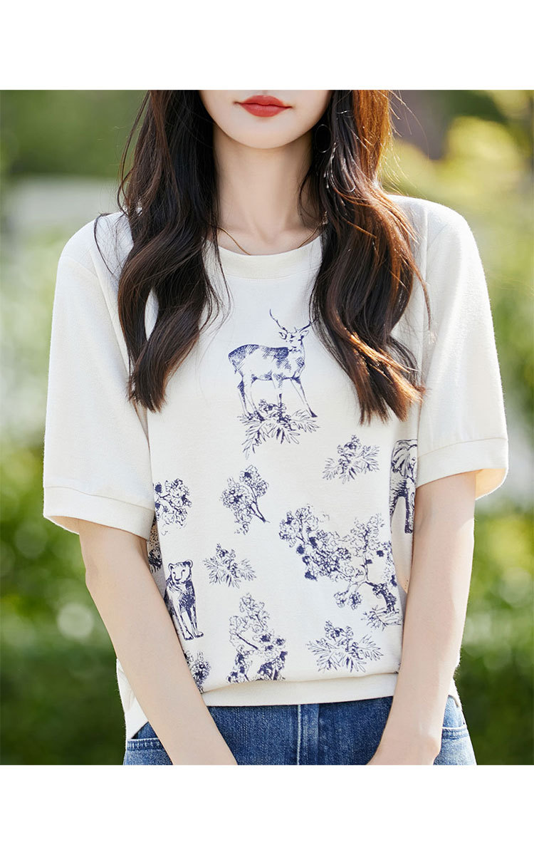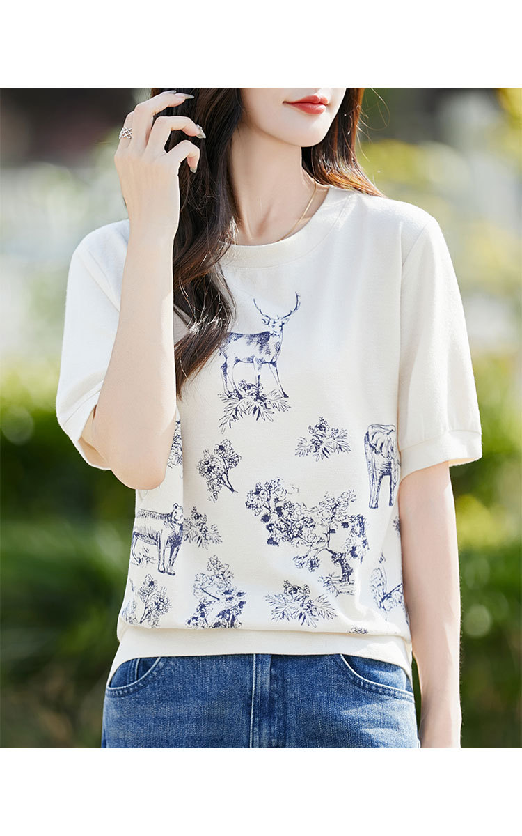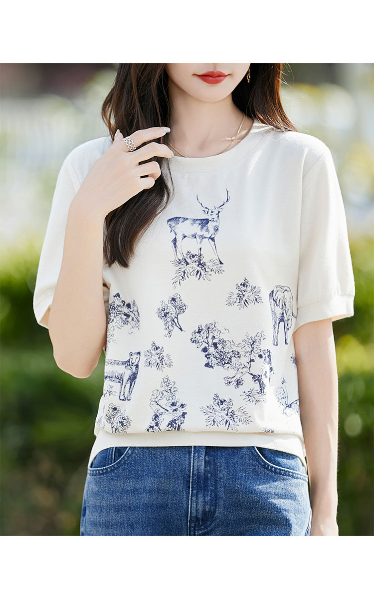 【含桑蚕丝 时尚印花】圆领舒适外穿休闲短袖T恤女薄款打底衫 521747