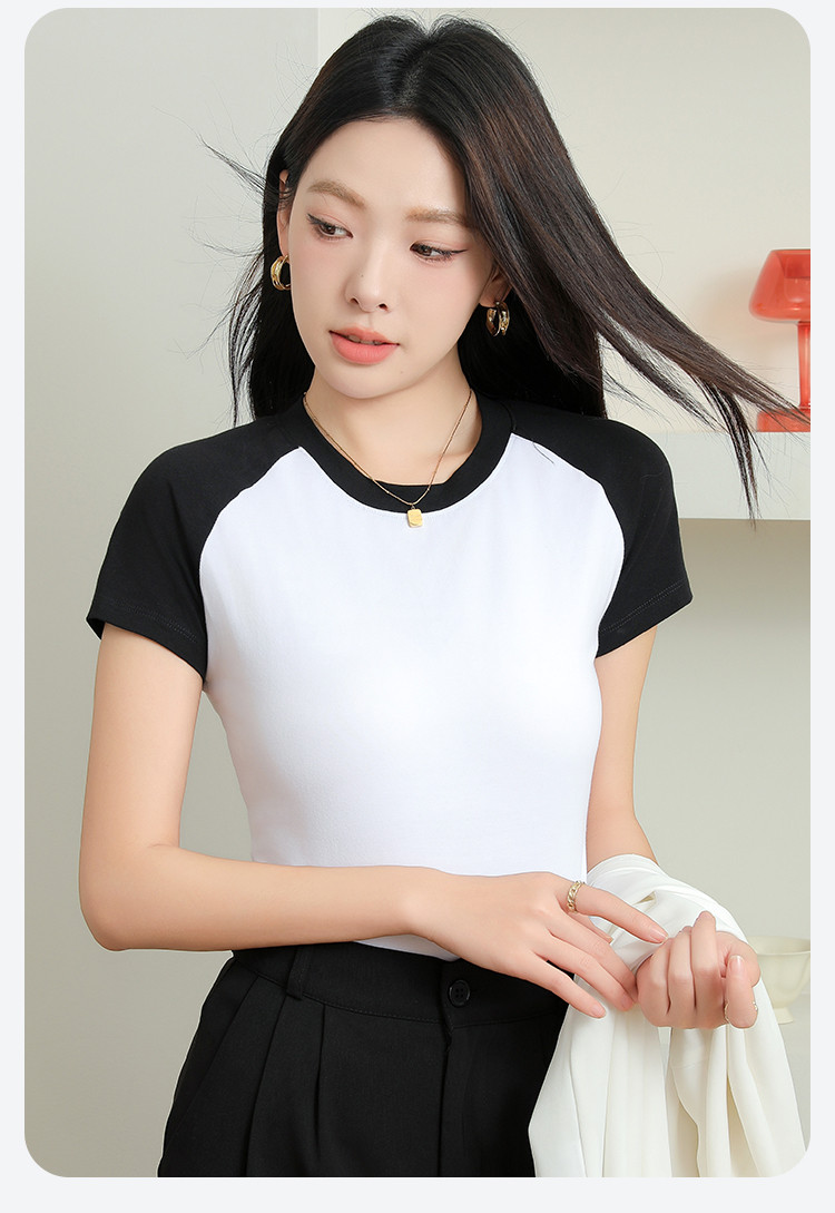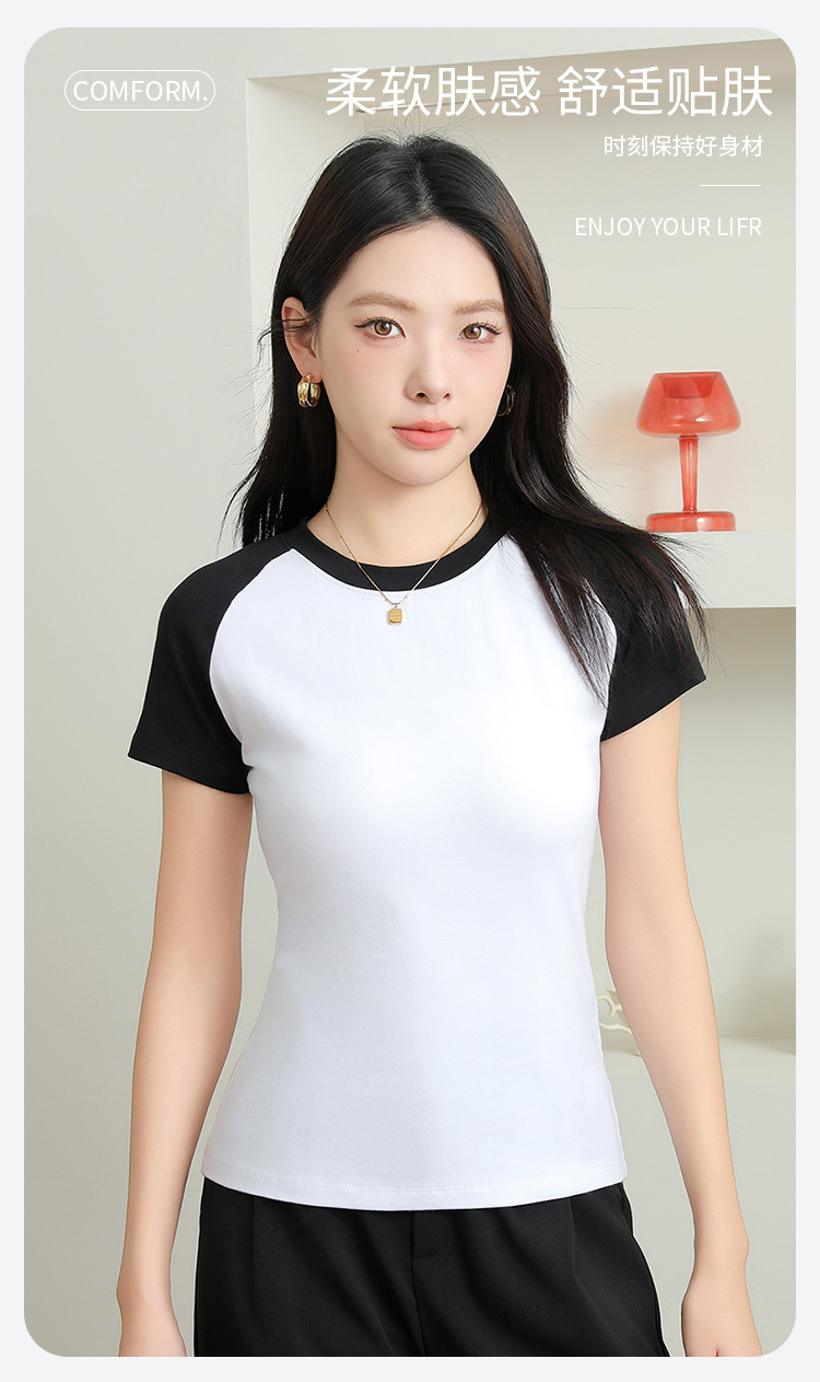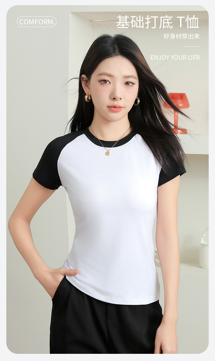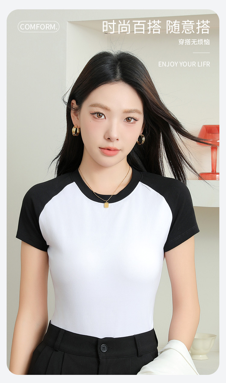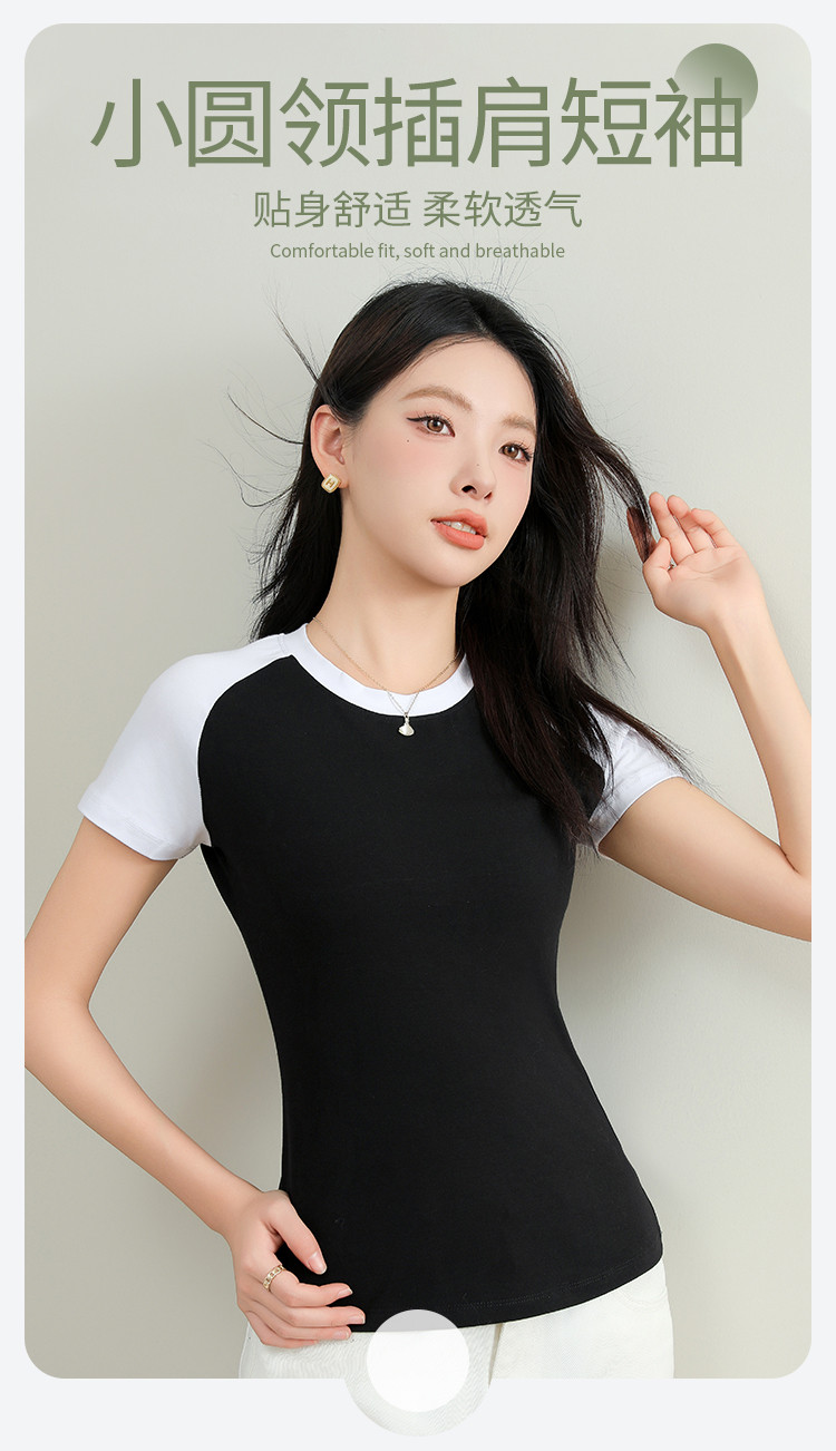 春夏女士打底衫女棉柔亲肤黑白撞色打底衫T恤女时尚圆领插肩短袖 655307