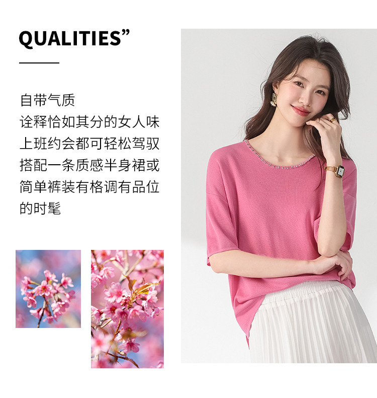 圆领钉珠针织衫女套头纯色含羊毛短袖T恤针织衫春装气质上衣 358227