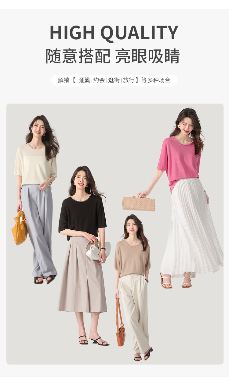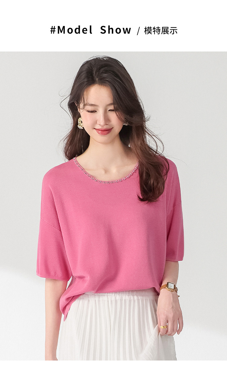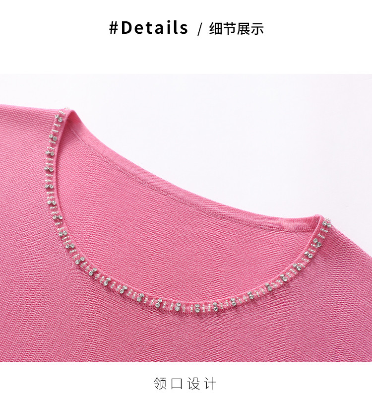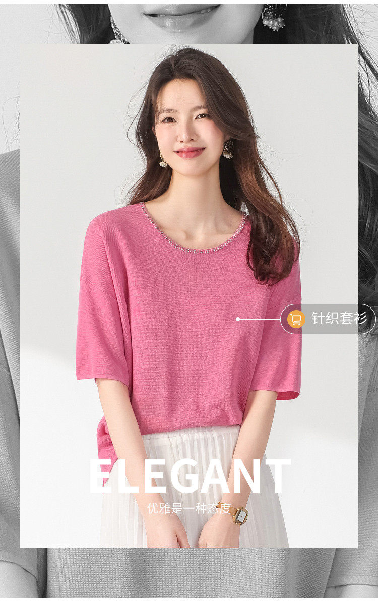 商品名称:圆领钉珠针织衫女套头纯色含羊毛短袖T恤针织衫春装气质上衣 358227